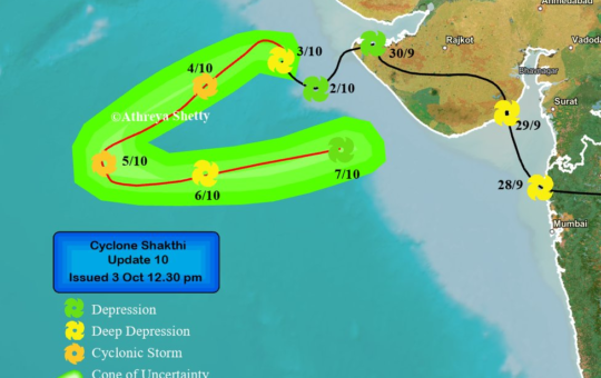 ડિપ્રેશન બાદ ડીપ ડિપ્રેશનમાં ફેરવાયાં બાદ હવે વવાઝોડું બન્યું વાવાઝોડાને "શક્તિ" નામ આપવામાં આવ્યું વાવાઝોડું નલિયા થી 290 દૂર અરબ...