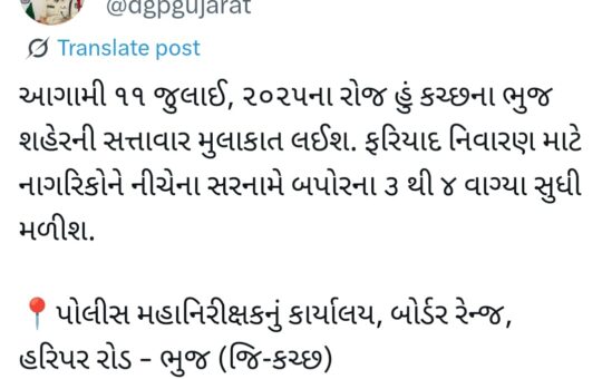 copy image DGP વિકાસ સહાય ભુજની મુલાકાતે ભુજના હરીપર પાસે આવેલ IG કચેરીમાં નાગરિકોની ફરિયાદ સાંભળશે DGP બપોરના 3 થી...