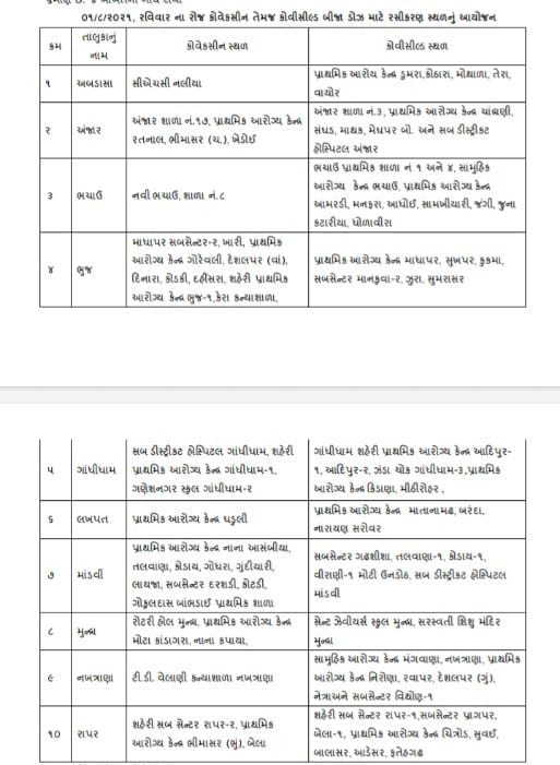 કચ્છ જિલ્લામાં તા. ૦૧/૦૮/ર૦ર૧ રવિવારના રોજ કોવેકસીન અને કોવીસીલ્ડ નો ફકત બીજો ડોઝ ચાલુ રહેશે. જે વ્યકિતઓએ કોવેકસીનનો પ્રથમ ડોઝ...