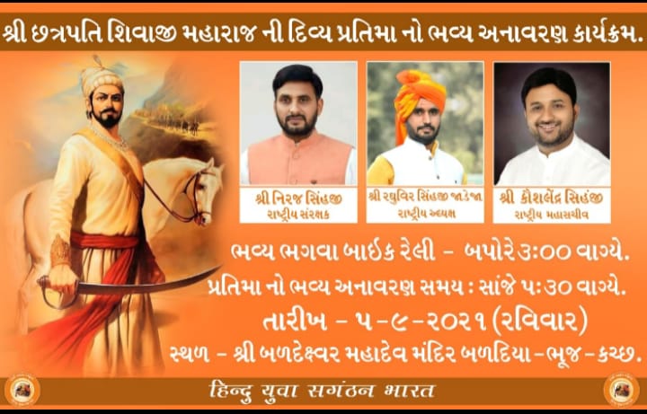 તારીખ,5-9-2021 રવિવાર ના રોજ બળદિયા ખાતે હિન્દુ યુવા સંગઠન ભારત દ્વારા બળદિયા ખાતે કચ્છ માં સર્વ પ્રથમ છત્રપતિ શિવાજી મહારાજ...