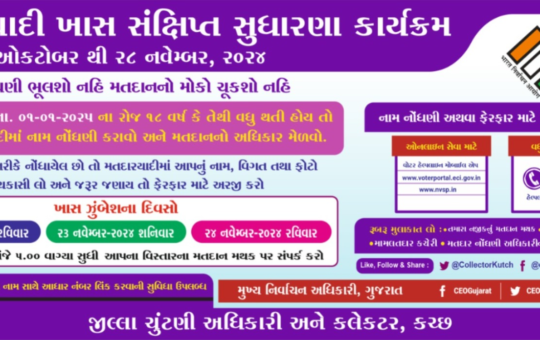 ચૂંટણીપંચની સુચનામુજબ કચ્છજિલ્લામાં તા.૧/૧/૨૦૨૫ નીલાયકાતની તારીખના સંદર્ભમાં સંકલિત મુસદ્દા મતદારયાદીતા.૨૯/૧૦/૨૦૨૪ ના રોજ પ્રસિદ્ધ થયેલ છે અને સુધારણા કાર્યક્રમ તા.૨૯/૧૦/૨૦૨૪ થી...