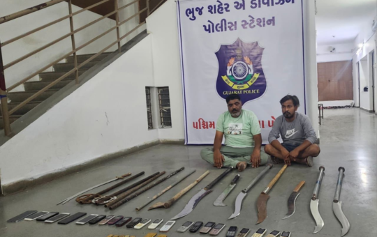 કોમ્બીંગ સર્ચ દરમ્યાન ગેરકાયદેસર હથીયાર તથા નકલી સોનાના બિસ્કીટ તથા બિલ વગરના મોબાઇલ સાથે આરોપીઓને પકડી પાડતી ભુજ શહેર એ ડીવીઝન પોલીસ તથા એસ.ઓ.જી.તથા એલ.સી.બી. ભજ કચ્છ