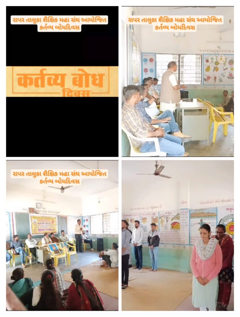 અખિલ ભારતીય રાષ્ટ્રીય શૈક્ષિક મહાસંઘના આહવાનથી તા-19/1/2024ના રોજ રાષ્ટ્રીય શૈક્ષિક મહાસંઘ રાપર તાલુકા દ્વારા શ્રી રવ કુમાર પ્રા. શાળા ખાતે કર્તવ્ય બોધ દિવસની ઉજવણી કરવામાં આવી હતી. કાર્યક્રમની શરૂઆત સરસ્વતી વંદનાથી કરવામાં આવી હતી, ત્યારબાદ તાલુકા અધ્યક્ષ નરેન્દ્રસિંહ જાડેજાએ સ્વાગત અને પ્રસંગ અનુરૂપ ઉદબોધન કર્યું હતું. મુખ્ય વકતા ભાઈલાલભાઈ જોષીએ કર્તવ્ય અને અધિકાર એકબીજાના પૂરક છે તે બાબત સ્વામી વિવેકાનંદ અને સુભાષચંદ્ર બોઝના જીવન દ્રષ્ટાંતો દ્વારા વર્ણવી અને શિક્ષકોને શ્રેષ્ઠ કર્તવ્ય નીભાવવા આહવાન કર્યું હતું. અભિજીતભાઈએ સંગઠનનો ઉદેશ્ય અને કાર્યો અંગે માહિતી આપી હતી. રમેશભાઈ મઢવીએ પ્રસંગ અપુરૂપ ઉદબોધન આપતાં રચનાત્મક કાર્યો કરવા પર ભાર મૂક્યો હતો. કાર્યક્રમનું સંચાલન ધવલભાઈએ કર્યું હતુ તેમજ સમગ્ર કાર્યક્રમના અંતેઆભારવિધિ બી.જે.સુથારએ કરવામાં આવી હતી. આ કાર્યક્રમમાં રાષ્ટ્રીય શૈક્ષિક મહાસંઘ રાપર તાલુકાના કાર્યકર્તાઓએ મોટી સંખ્યામાં ભાગ લીધો હતો આ કાર્યક્રમમાં કનુજી ઠાકોર, યશપાલસિંહ જાડેજા કાંતિલાલ સાહેબ હિતેશભાઈવગેરે હાજર રહ્યા હતા. તેમજ સી.આર.સી કેતનભાઈ ,પરબતભાઈ તથા મોટી સંખ્યામાં શિક્ષક કાર્યકર્તા ભાઈઓ તથા બહેનો ઉપસ્થિત રહ્યા હતા.