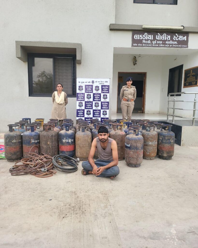 મે.પોલીસ મહાનિરિક્ષક ચિરાગ કોરડીયા સાહેબ સરહદી રેન્જ ભુજ કચ્છ તથા મે.પોલીસ અધિક્ષકશ્રી સાગર બાગમાર સાહેબ અને મે.નાયબ પોલીસ અધિક્ષકશ્રી સાગર સાંબડા સાહેબનાઓએ મિલ્કત સબંધી બનતા બનાવો અટકાવવા સારુ આપેલ સુચના અને માર્ગદર્શન આધારે પોલીસ ઇન્સ્પેક્ટર જે.એમ.જાડેજા નાઓની સુચના મુજબ લાકડીયા પોલીસ સ્ટાફના માણસો કોમ્બિંગ નાઈટ રાઉન્ટમાં હતા દરમ્યાન ખાનગી રાહે મળેલ બાતમી હકિકત આધારે લાકડીયા પોલીસ સ્ટેશન હદ વિસ્તારમાં મોરબી-સામખીયાળી નેશનલ હાઈવે પર આવેલ આશુવીરા હોટલની પાછળના ભાગે આવેલ ખુલ્લી જગ્યામાંથી કોઈપણ જાતના આધાર-પુરાવા વગરના ચોરી-છળકપટથી મેળવેલ ગેસના ખાલી બાટલા નંગ-૪૧ તથા ગેસ ભરવાની નોઝલ સહિત શકપડતા મુદામાલ સાથે આરોપી મહીપાલ કિષ્નારામ બિશ્નોઇ ઉ.વ.૨૯ રહે.મુળ.મુલરાજ તા.ફલૌદિ જી.જોધપુર રાજસ્થાન રહે.હાલે.શક્તિનગર મુંદ્રા તા.મુંદ્રા,કચ્છવાળાને ઝડપી પાડવામાં આવેલ અને ઉપરોક્ત મુદામાલ બી.એન.એન.એસની કલમ-૧૦૬ મુજબ કબ્જે લઈ પકડાયેલ આરોપીને બી.એન.એસ.એસની કલમ-૩૫ (૧)(ઈ) તળે ધોરણસર અટક કરી આગળની વધુ તપાસ હાથ ધરવામાં આવેલ છે. > પકડાયેલ આરોપી :મહીપાલ કિશનારામ બિશ્નોઇ ઉ.વ.૨૯ મુળ રહે.મુલરાજ તા.ફલૌદિ જિ.જોધપુર,રાજસ્થાન હાલ રહે.શક્તિનગર મુંદ્રા તા.મુંદ્રા કચ્છ > કબ્જે કરેલ મુદામાલ: અલગ-અલગ કંપનીના ખાલી ગેસ બાટલા નંગ-૪૧ કિ.રૂ.૪૧,૦૦૦/- ગેસના બાટલા ભરવાની નોઝલ કિ.રૂ.૯,૦૦૦/- > કુલ કિંમત: રૂ. ૫૦,૦૦૦/- આ કામગીરી જે.એમ.જાડેજા પોલીસ ઇન્સ્પેક્ટર તથા પો.હેડ કોન્સ. ભાવનાબેન ચૌધરી તથા પો.કોન્સ.હકુમતસિંહ જાડેજા અને હસમુખભાઈ દ્વારા કરવામાં આવેલ છે.