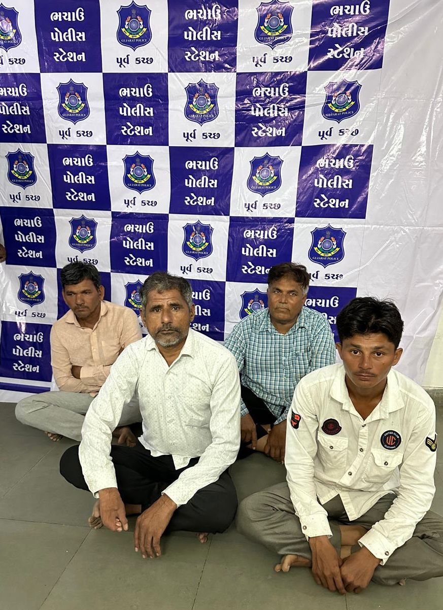 પોલીસ મહાનીરીક્ષકશ્રી ચિરાગ કોરડીયાસાહેબ બોર્ડર રેન્જ ભુજ કચ્છ તથા મે.પોલીસ અધિક્ષકશ્રી સાગર બાગમારસાહેબ પૂર્વ-કચ્છ (ગાંધીધામ) તથા નાયબ પોલીસ અધિક્ષકશ્રી સાગર સાંબડા સાહેબ ભચાઉ વિભાગ,ભચાઉનાઓ તરફથી જિલ્લામાં પ્રોહીબિશન તથા જુગારની બદી નેસ્ત નાબુદ કરવા આપેલ સુચના અને માર્ગદર્શન હેઠળ તેમજ પોલીસ ઇન્સપેક્ટરથી એસ.ડી.સિસોદીયા નાઓની સુચના અન્વયે સર્વેલન્સ સ્ટાફના માણસો ભચાઉ પોલીસ સ્ટેશન વિસ્તારમાં પેટ્રોલીંગમાં હતા દરમ્યાન ખાનગી બાતમી હકીકત આધારે ભચાઉ ચોબારી ગામના પાધર વાડી વિસ્તારમાં આવેલ બાવળોની ઝાડીમાં જાહેર ખુલ્લી જગ્યામાં ગંજીપાના વડે રૂપિયાની હારજીતનો તીનપતીનો જુગાર રમતા આરોપીઓને પકડી પાડી ધોરણસર કાર્યવાહી કરવામાં આવેલ છે. > પકડાયેલ આરોપીઓ (૧) રણમલભાઈ ભુરાભાઈ ઢીલા (આહિર) ઉ.વ.૫૬ રહે.જુના ગામ ચોબારી તા.ભચાઉ (૨) મનજીભાઈ આલાભાઈ મકવાણા ઉ.વ.૫૦ રહે.ચામુંડા નગર ચોબારી તા.ભચાઉ (3) ગોવિંદભાઈ અરજણભાઈ મેરિયા ઉ.વ.૫૦ રહે. ચામુંડા નગર ચોબારી તા.ભચાઉ (૪) રમેશભાઈ નારણભાઈ જાદવ ઉ.વ.૨૨ રહે.ભુરાગડા વિસ્તાર ચોબારી તા.ભચાઉ આ કામગીરીમાં પોલીસ ઇન્સપેક્ટર શ્રી એસ.ડી.સિસોદીયા તથા સર્વેલન્સ સ્ટાફના માણસો દ્વારા કરવામાં આવેલ છે.