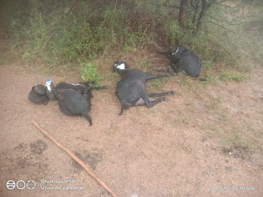 ટોટલ 70 થી 80 બકરીઓમાંથી ત્રણના મોત અને ત્રણ ચાર બકરીઓ વીજળીમાં ગંભીર રીતે દાજી અને એક બકરી ની હાલત ખરાબ