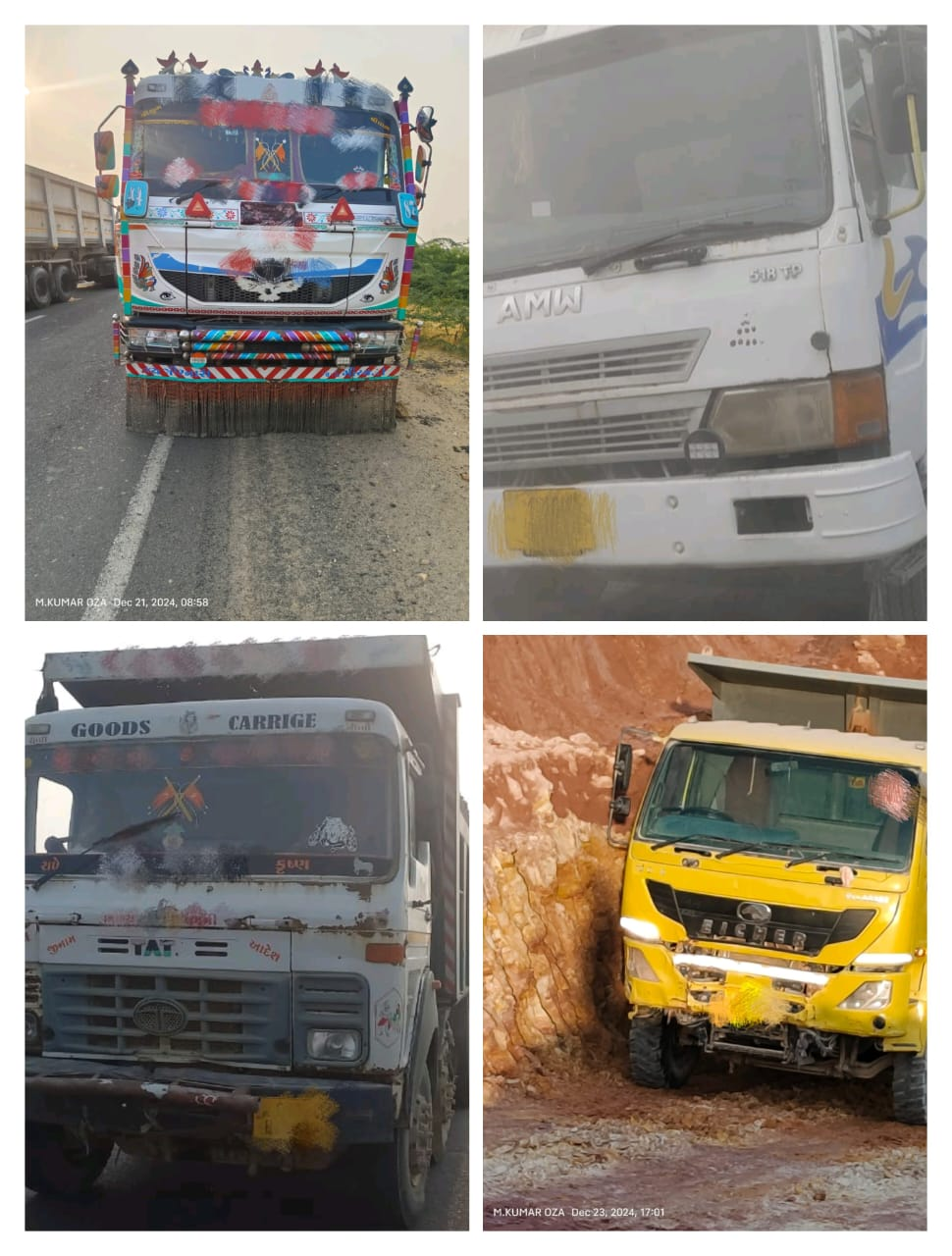 માનનીય કલેક્ટરશ્રી-કચ્છનાઓની સુચના અને માર્ગદર્શન હેઠળ પ્રાંત અધીકારીશ્રી-ભુજ તથા મદદનીશ નિયામકશ્રી (ફ્લાઈંગ સક્વોર્ડ) ભુજનાઓ દ્વારા તા.21/12/2024ના રોજ સંયુક્ત રીતે ભુજ તાલુકાના ખાવડા ખાતે આકસ્મિક તપાસ હાથ ધરી .અધિકૃત રોયલ્ટીપાસ કરતા વધુ બ્લેકટ્રેપ ખનિજનો જથ્થો વહન કરવા બદલ એક ટ્રક તથા તેવી જ રીતે રોયલ્ટીપાસ કરતા વધુ લાઈમસ્ટોન ખનિજનો જથ્થો વહન કરવા બદલ ત્રણ ટ્રક એમ કુલ ચાર ટ્રકોને સીઝ કરી ખાવડા પોલીસ સ્ટેશન ખાતે કસ્ટડીમાં રાખવામાં આવેલ તથા તે અંગેની દંડકીય કાર્યવાહી હાથ ધરવામાં આવેલ.