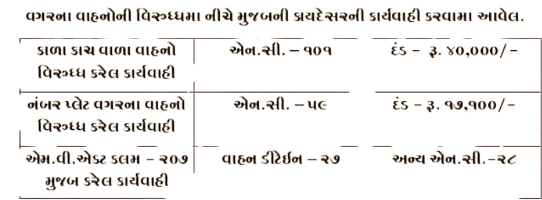 મ્હે.પોલીસ મહાનિરીક્ષકશ્રી સરહદી રેન્જ ભુજ-કચ્છ ચિરાગ કોરડીયા સાહેબનાઓની સુચનાથી અત્રેના પૂર્વ-કચ્છ ગાંધીધામ જીલ્લામાં પોલીસ અધિક્ષકશ્રી સાગર બાગમાર સાહેબના માર્ગદર્શન હેઠળ પૂર્વ-કચ્છ જીલ્લામાં કાળા કાચ અને નંબર પ્લેટ વગરના વાહનોની વિરુધ્ધ કાયદેસરની કાર્યવાહી કરવા સારૂ એક દિવસ તા- ૦૪/૦૧/૨૦૨૫ ના રોજની સ્પેશ્યલ ડ્રાઈવ આપવામાં આવેલ. જે ડ્રાઈવ દરમ્યાન અત્રેના જિલ્લામાં પોલીસની અલગ-અલગ ટીમો બનાવી કાળા કાચ અને નંબર પ્લેટ વગરના વાહનોની વિરુધ્ધમા નીચે મુજબની કાયદેસરની કાર્યવાહી કરવામાં આવેલ.