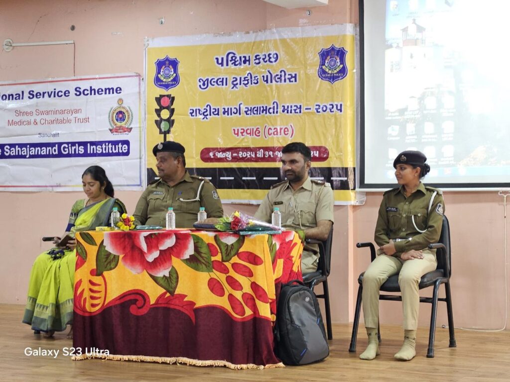 ભુજ: ૩૫* માં રાષ્ટ્રીય માર્ગ સલામતી માસની ઉજવણીના ભાગરૂપે આજ રોજ શ્રી સહજાનંદ ગર્લ્સ ઇન્સ્ટિટ્યૂટમાં આરટીઓ અને પોલીસ ડિપાર્ટમેન્ટ દ્વારા એક વિશેષ સેમિનારનું આયોજન કરવામાં આવ્યું હતું. આ સેમિનારનો મુખ્ય હેતુ માર્ગ સલામતી અંગે જાગૃતિ ફેલાવવાનો અને યુવાઓને સલામત ટ્રાફિકની જરૂરિયાત અંગે સમજાવવા નો હતો.