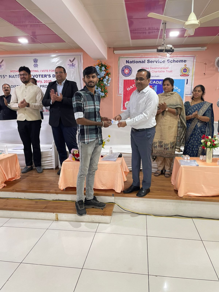 રાષ્ટ્રીય મતદાતા દિવસ ઉજવણી કાર્યક્રમમાં નવા મતદારોને ચૂંટણી કાર્ડ આપીને તેમનું સન્માન કરાયું હતું. આ ઉપરાંત જિલ્લા શ્રેષ્ઠ મતદાર નોંધણી અધિકારીશ્રી, મદદનીશ મતદાર નોંધણી અધિકારીશ્રી, નાયબ મામલતદારશ્રી, બી.એલ.ઓ, સેક્ટર ઓફિસર અને કેમ્પસ એમ્બેસેડરની કામગીરીને મહાનુભાવોએ પ્રમાણપત્ર આપીને બિરદાવી હતી. આ પ્રસંગે યુવા મતદાર મહોત્સવ ૨૦૨૫ અંતર્ગત જિલ્લાકક્ષાની વિવિધ સ્પર્ધાઓ જેવી કે, શોર્ટ વીડિયો, ઈ-પોસ્ટર્સ, ઝીંગલ્સ, ટેગલાઈન/સ્લૉગન, પૉસ્ટર ડિઝાઈન વગેરે કેટેગરીમાં પ્રથમ અને દ્વિતીય નંબર મેળવેલ વિજેતાઓને પ્રમાણપત્ર એનાયત કરવામાં આવ્યા હતા.