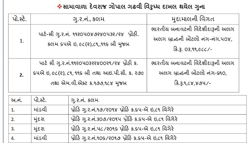 જે સુચના અનુસંધાને શ્રી વિકાસ સુંડા સાહેબ પોલીસ અધિક્ષકશ્રી પશ્ચિમ કચ્છ-ભુજનાઓના સીધા માર્ગદર્શન હેઠળ લોકલ ક્રાઇમ બ્રાન્ચ દ્વારા પશ્ચિમ કચ્છ જીલ્લામાં જાહેર જનતામાં અસમાજિક પ્રવુત્તિ ફેલાવતા ઇસમો જેમાં ભારતીય બનાવટના વિદેશી દારૂનો વેચાણ કરતાં ઇસમ દેવરાજ ગોપાલ ગઢવી ઉવ.૪૨ રહે.ભક્તિનગર, કલવાણા રોડ, માંડવી, મુળ રહે.પાંચોટીયા તા.માંડવીવાળા વિરૂધ્ધમાં ભારતીય બનાવટના વિદેશીદારૂનો જથ્થો રાખી વેચાણ કરવાના ગુનોઓ દાખલ થયેલ હોય. જેથી આ ઈસમની ગેરકાયદેસર પ્રવૃતીથી લોકોના જાહેર જીવન પર ખુબ જ ગંભીર અસર પડતી હોય જેથી આ ઇસમની અસામાજીક પ્રવૃતી અટકાવવી ખૂબ જ જરૂરી હોય.