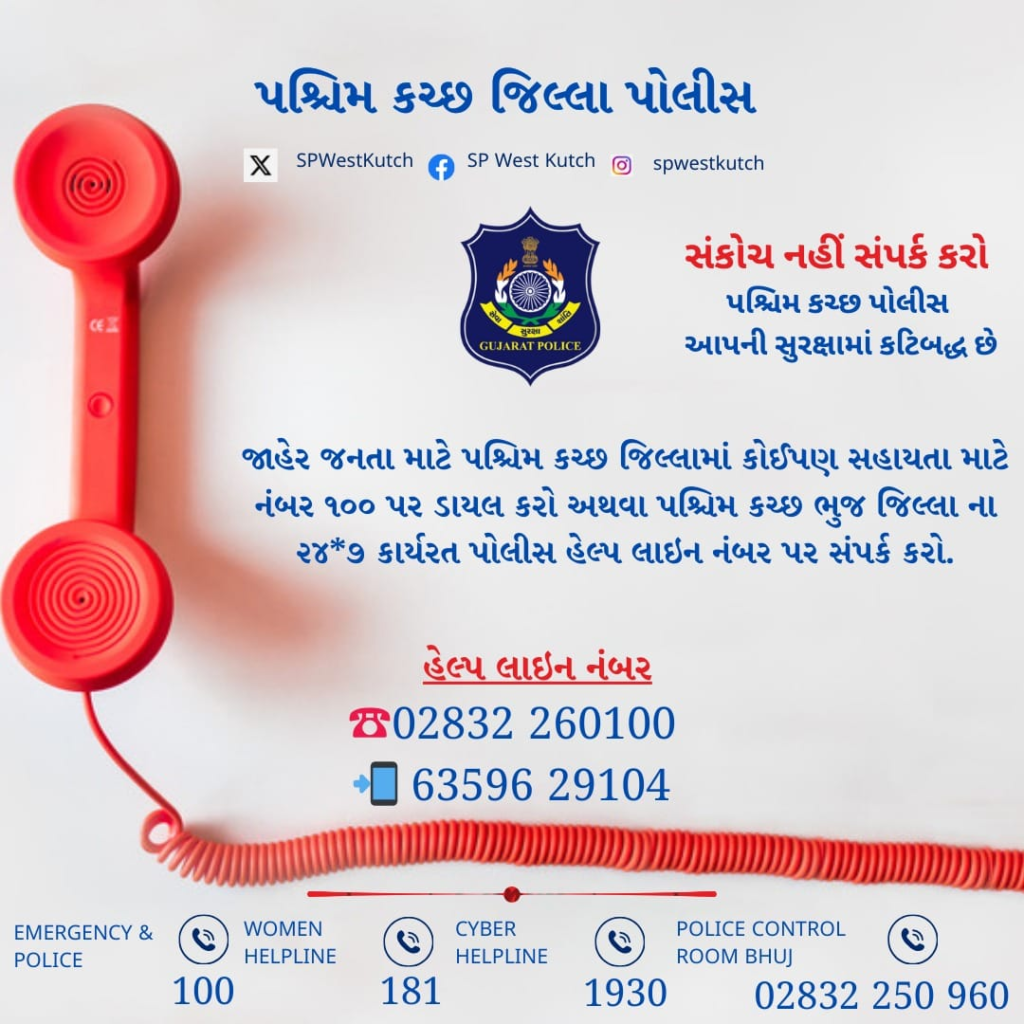 Breaking News Kutch પશ્ચિમ કચ્છ પોલીસ હંમેશા તમારી સાથે! : પશ્ચિમ કચ્છ પોલીસ દ્વારા જાહેર જનતા માટે ૨૪*૭ કલાક હેલ્પ લાઇન નંબર ચાલુ કરાયા : 📞 ૦૨૮૩૨ ૨૬૦૧૦૦ | 📲 ૬૩૫૯૬ ૨૯૧૦૪ 12 months ago Kutch Care News Continue Reading Previous અંતરજાળની જગદંબા સોસાયટીમાં બંધ મકાનમાંથી 1.83 લાખની મત્તા પર હાથ સાફ કરી ચોર ઈશમો થયા ફરારNext ગાંધીધામના મીઠીરોહરમાં એક ગોદામમાંથી 52 હજારના ચોખાની ચોરીનો મામલો પોલીસ ચોપડે ચડ્યો More Stories Crime Kutch ડાવરી નજીક ભેંસમાં બાઈક અથડાતા સર્જાયેલ અકસ્માતમાં યુવાનનું મોત 9 mins ago Kutch Care News Breaking News Gujarat Kutch 2026નું ઉનાળું કચ્છ અને સમગ્ર ગુજરાત માટે સામાન્ય કરતા વધુ અનુકૂળ અને બદલાતું રહેવાની શક્યતા 41 mins ago Kutch Care News Crime Kutch ભારાપરમાં છરી કાઢી અને ગાળાગાળી કરતો વિડિયો બનાવી વાયરલ કરનાર બેની ધરપકડ 51 mins ago Kutch Care News