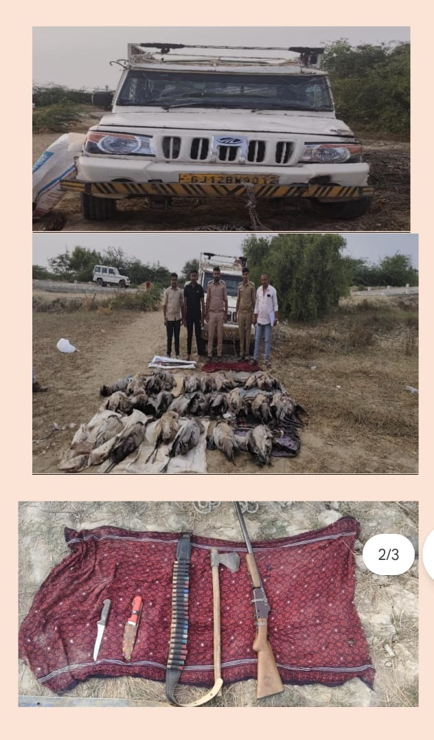 હથિયાર ધારાના સફળ કેસો શોધવા માટે મે.આઇ.જી.પી શ્રી ચિરાગ કોરડીયા સાહેબ,સરહદી રેન્જ,ભુજ તથા પોલીસ અધિક્ષકશ્રી વીકાસ સુંડા સાહેબ તથા નાયબ પોલીસ અધિક્ષકશ્રી બી.બી.ભગોરા સાહેબ, નખત્રાણા વિભાગ નખત્રાણાનાઓના માર્ગદશન તથા ઈન્ચાર્જ પો.ઈન્સ એ.એમ.મકવાણા નિરોણા પોલીસ સ્ટેશનના સુચના મુજબ પોલીસ સ્ટેશન હાજર હતા તે દરમ્યાન સ્ટાફના માણસોને ખાનગી રાહે બાતમી હકિકત આધારે વંગ ગામથી ઉતરે કંજરવેશન રણ વિસ્તારમાં કુંજ પક્ષીનો ગેરકાયદેસર દેશી બંદુક વડે શિકાર થાય છે જેથી રેઈડ કરતા બોલેરો પીક-અપ ગાડીમા ૨૫ કુંજ પક્ષીના મુતદેહ તથા દેશીબંદુક તથા કાર્તીસ જીવતા તથા ખાલી નંગ-૨૪ તથા બે છરી તથા એક કુહાડી પકડી તેમજ શિકાર કરેલ ૨૫ કુંજ પક્ષી વન્ય પ્રાણી અધિ.અન્વયે કાયદેશરની કાર્યવાહી કરવા ફોરેસ્ટને શોંપેલ તેમજ ગેરકાયદેસર રીતે પકડાયેલ હથીયાર અંગે નિરોણા પોલીસ સ્ટેશન પાર્ટ-બી ગુ.ર.નં- ૧૫/૨૦૨૫ આમ્સ એકટ ૧૯૫૯ ની કલમ-૨૫(૧-બી)એ, ૨૭,૩૫ તથા જી.પી. એક્ટ કલમ ૧૩૫ મુજબનો ગુનો દાખલ કરેલ છે.