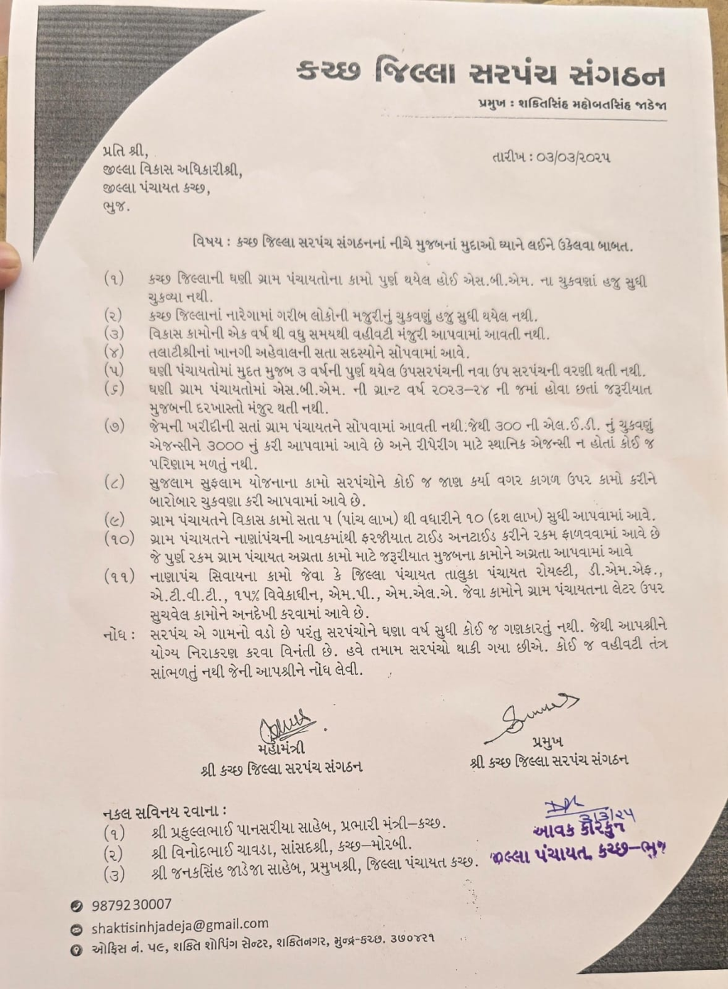 વિષય: કચ્છ જિલ્લા સરપંચ સંગઠનનાં નીચે મુજબનાં મુદાઓ ધ્યાને લઈને ઉકેલવા બાબત.