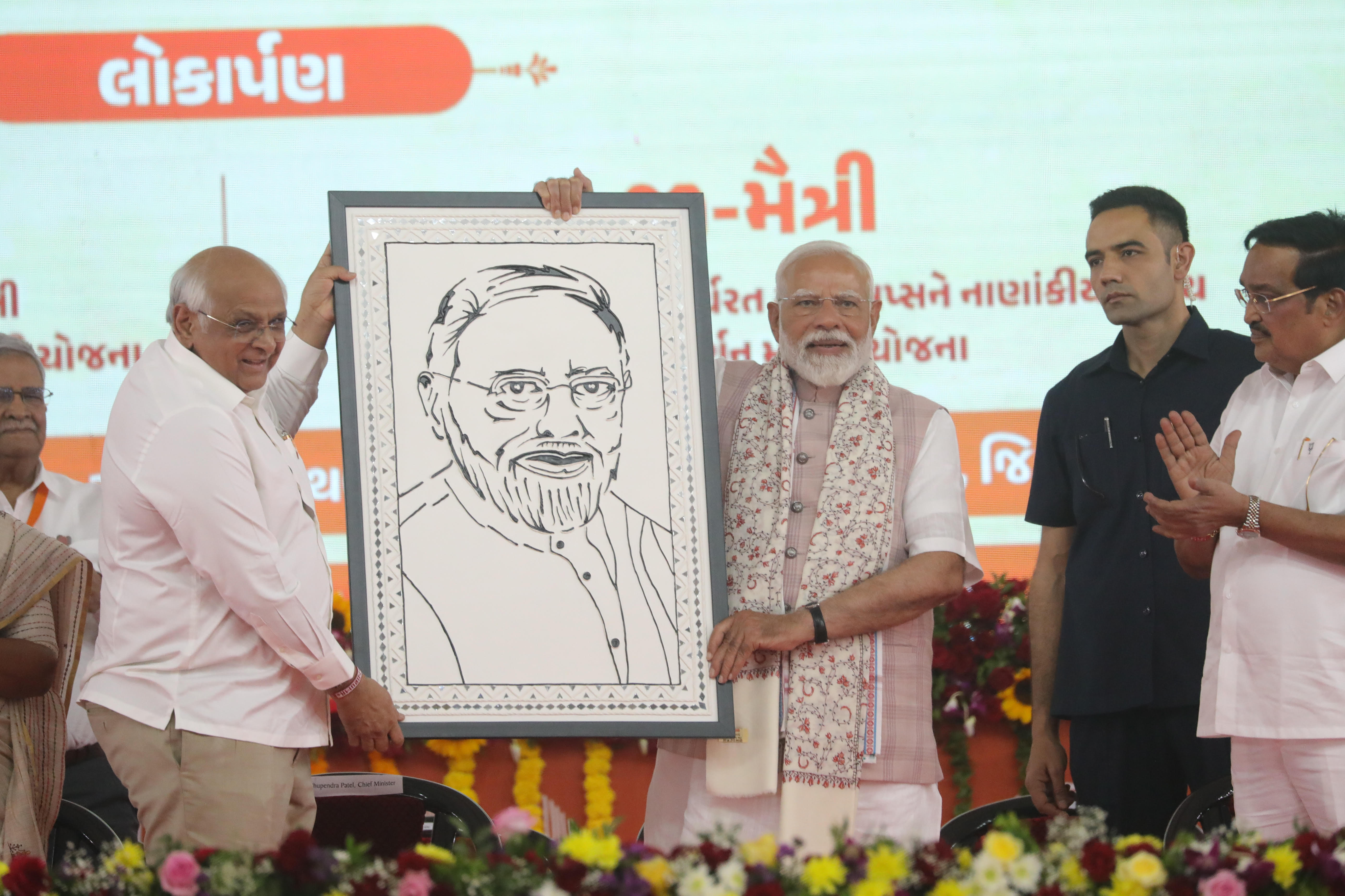 વડાપ્રધાનશ્રી નરેન્દ્ર મોદીના અધ્યક્ષસ્થાને નવસારીના વાંસી-બોરસી ખાતે ‘લખપતિ દીદી’ઓના સન્માન સાથે વિશ્વ મહિલા દિવસની ઉજવણીનો કાર્યક્રમ યોજાયો હતો. આ કાર્યક્રમમાં ગુજરાતની ધરા ઉપર પધારેલા વડાપ્રધાનશ્રી નરેન્દ્રભાઈ મોદીનું ગુજરાતના મુખ્યમંત્રીશ્રી ભૂપેન્દ્ર પટેલ દ્વારા કચ્છી મડવર્ક ફ્રેમથી સ્વાગત કરવામાં આવ્યું હતું. ઉલ્લેખનીય છે કે, આ મર્ડવર્ક ફ્રેમ કચ્છના ભુજ તાલુકાના ભારાપર ગામના સિમરન સખી મંડળના બહેનો દ્વારા તૈયાર કરવામાં આવી છે.