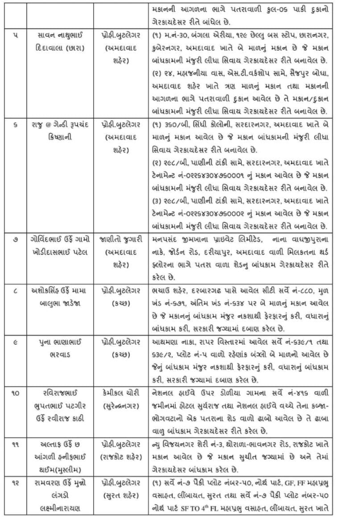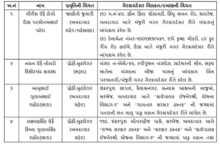 સ્ટેટ મોનીટરીંગ સેલની ટીમો દ્વારા જરૂરી તપાસ કરી, સબંધિત સરકારી કચેરીઓથી માહિતી મેળવતાં, નીચે મુજબના કુલ-૧૫ અસમાજિક તત્વોની કુલ-૧૯ ગેરકાયદેસરની મિલકત/દબાણ જણાઈ આવેલ છે.