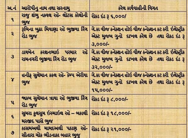 જે અન્વયે ભુજ શહેર બી ડીવીઝન પો.સ્ટે.ના પો.ઇન્સ.શ્રી જે.કે.મોરી સાહેબના માર્ગદર્શન હેઠળ, ભુજ શહેર બી ડીવીઝન પોલીસ સ્ટેશનમા શરીર સંબધી /પ્રોહિબીશન ના આરોપીઓને ચેક કરવા ભુજ શહેર બી ડીવીઝન પોલીસ સ્ટેશનની ટીમ બનાવેલ તથા પી.જી.વી.સી.એલના અધીકારી કર્મચારીને સાથે ગેર કાયદેસર વીજ જોડાણ હોય તેવા ઇશમોના વીજ કનેકશન કાપી નીચે મુજબની કાયદેસરની કાર્યવાહી કરવામા આવેલ છે.
