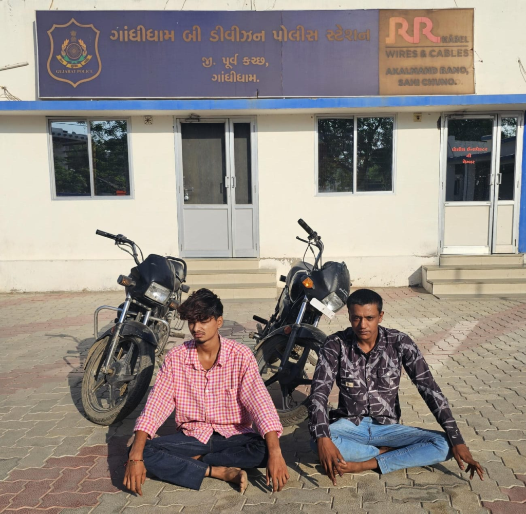 આદિપુર વિસ્તા૨માં થયેલ મોટર સાયકલ ચોરીનો ભેદ ઉકેલી બે આરોપીઓ ને બે મોટર સાયકલ સાથે પકડી પાડતી ગાંધીધામ “બી” ડીવીઝન પોલીસ