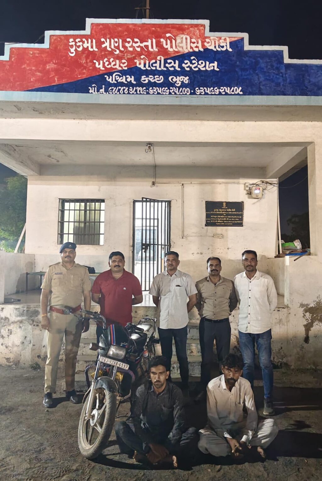 જે અન્વયે પો.ઇન્સ એ.જી.પરમાર સાહેબ પધ્ધર પોલીસ સ્ટેશન નાઓના માર્ગદર્શન તેમજ સુચના અનવ્યે પોલીસ સ્ટાફના માણસો પોલીસ સ્ટેશન વિસ્તારમાં ફસ્ટ ગુ.ર.નં ૩૨૬/૨૦૨૫ B.N.S કલમ ૬૨, ૩૦૫-એ. ૩૨૪-૪, ૩૩૧-૪. ના ગુન્હા કામે આરોપીની તપાસમા હતા તે દરમ્યાન સાથેના એ.એસ.આઇ મહેન્દ્રસિંહ જાડેજા તથા પો હેડ કોન્સ મહિપાલસિંહ જાડેજા નાઓને સયુકત બાતમી હકીકત મળેલ કે, ડગાળા ગામેથી મંદિર ચોરી કરેલ શંકાસ્પદ ઇસમો (૧) ઉંમર સીધીક સમા તથા (૨) જકરીયા અમીન સમા હાલે લેર સીમમા આવેલ આશાપુરા કંપની પાસે મોટર સાયકલ થી હાજર છે જેથી તુરંત જ વર્ક આઉટ કરી સદર જ્ગ્યાએથી રાઉન્ડઅપ કરી પો સ્ટે લાવી પો.ઇન્સ એ.જી.પરમાર સાહેબ નાઓએ યુક્તી પ્રયુકિતથી પુછપરછ કરતા મજકુર ઇસમો ભાંગીપડી ઉપરોકત ગુન્હો આચરેલ હોવાનું કબુલાત કરેલ અને ગુન્હા કામે ઉપયોગમા લીધેલ વાહન સાથે આરોપીને અટક કરી કાયદેસરની કાર્યવાહી કરવામાં આવેલ છે.
