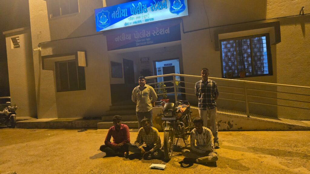 હોવાનું જણાવેલ તેમજ તેમના કબ્જામાં રહેલ મો.સા.નો ઉપરોક્ત ચોરી કરવામાં ઉપયોગમાં લીધેલ હોવાનું જણાવેલ જેથી મજકુર ત્રણેય આરોપીઓને ઉપરોક્ત મળી આવેલ મુદ્દામાલ સાથે હસ્તગત કરી મજકુર ઇસમોને આગળની કાર્યવાહી સારૂ નલીયા પોલીસ સ્ટેશન ખાતે સોપવામાં આવેલ છે.