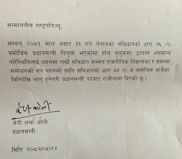 નેપાળમાં યુવાનોએ કરેલા ભારે વિરોધપ્રદર્શન પછી વડા પ્રધાન કેપી શર્મા ઓલીએ તેમના પદેથી રાજીનામું આપી દીધું