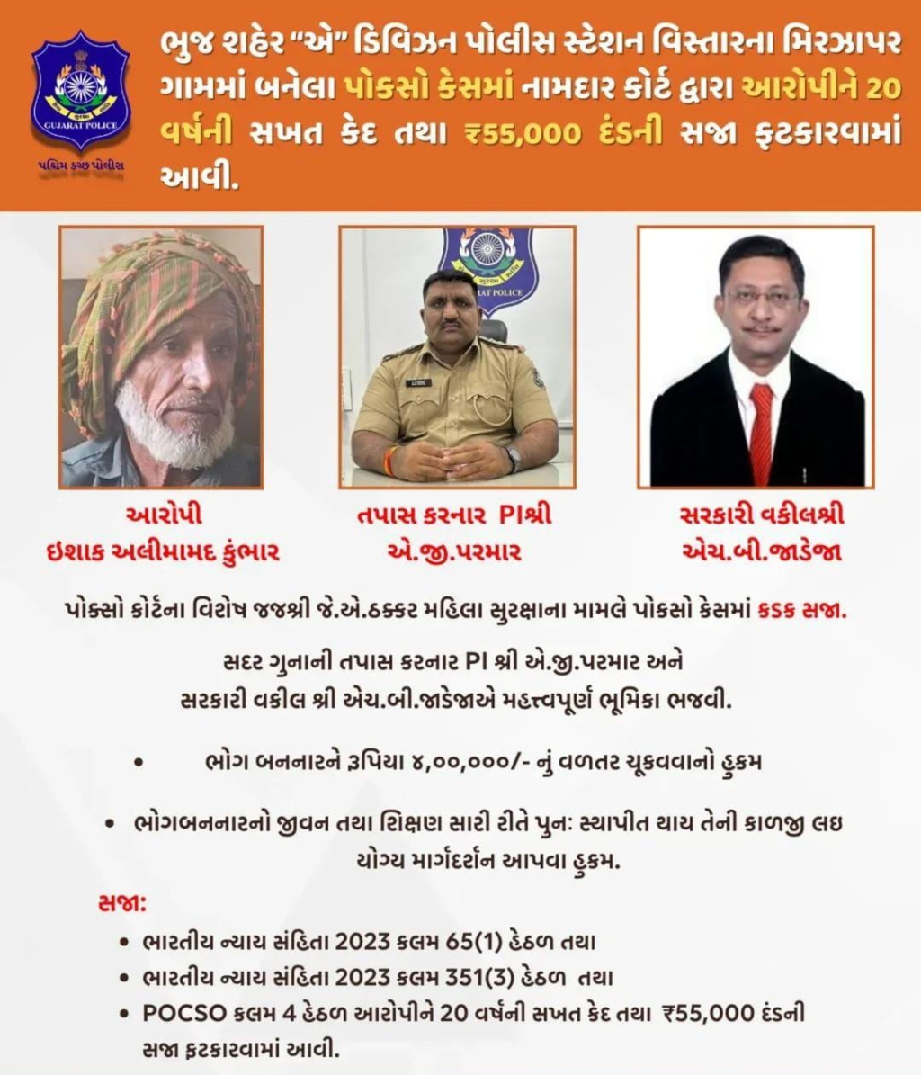 ભુજ શહેર “એ” ડિવિઝન પોલીસ સ્ટેશન વિસ્તારના મિરઝાપર ગામમાં બનેલા પોકસો કેસમાં નામદાર કોર્ટ દ્વારા આરોપીને 20 વર્ષની સખત કેદ તથા ₹55,000 દંડની સજા ફટકારવામાં આવી.