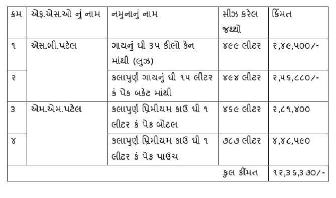 આજ તા.૦૩/૧૦/૨૦૨૫ ના રોજ ૧૩:૦૦ કલાકે મે કલાપુર્ણ ઘી, સર્વે નં: ૪૯૫, પ્લોટ નં: ૨૦, કોટવાલ ઓઇલ મીલની સામે, નાગોરી રેલવે ક્રોસીંગ પાસે, ભુજ-કચ્છ બાતમી ના આધારે રેડ કરવામાં આવેલ. રેડ દરમ્યાન સ્થળ પરનાં જવાબદાર વ્યક્તિ શ્રી રાયમા ઇરફાન અસગરઅલી જ્યારે સદર ધંધાના મુળ માલિક શ્રી નિલેષ રસિકલાલ ત્રેવડીયા જણાયેલ અને તપાસ દરમ્યાન સ્થળ પરનાં હાજર વ્યક્તિ શ્રી રાયમા ઇરફાન અસગરઅલી શંકાસ્પદ ઘી બનાવતાં હોવાની પ્રાથમિક દ્રષ્ટીએ શંકા જણાતા ફુડ સેફ્ટી ઓફીસર એસ.બી.પટેલ તથા એમ.એમ.પટેલ દ્વારા ધી ફૂડ સેફટી સ્ટાંન્ડર્ડ એક્ટ-૨૦૦૬ હેઠળ નીચે મુજબના નમુના લેવાની તેમજ બાકીનો જથ્થો માનવ વપરાશમાં ન આવે તે હેતુથી સ્થળ પર સીઝ કરવામાં આવેલ છે.