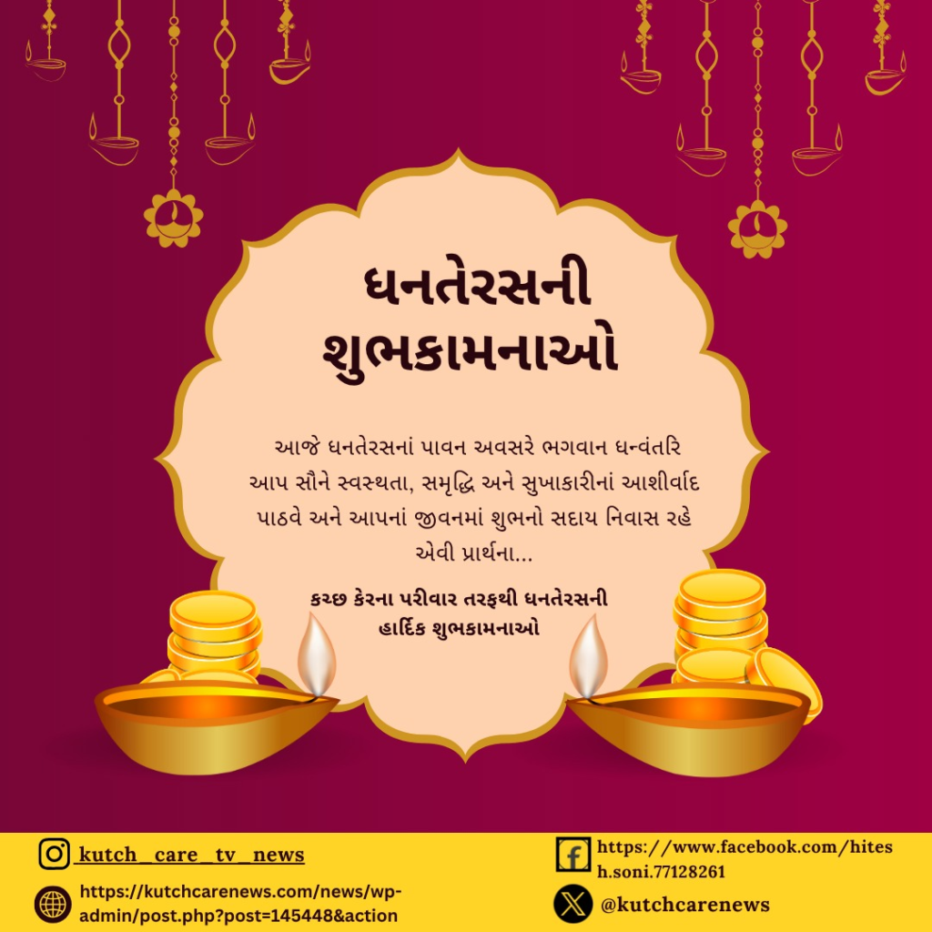 Gujarat India Kutch તમામ દર્શકમિત્રોને કચ્છ કેરના પરીવાર તરફથી ધનતેરસની હાર્દિક શુભકામના 2 days ago Kutch Care News Continue Reading Previous ગુજરાત નું નવું મંત્રી મંડળNext ભચાઉ નજીક ઊભેલા ટ્રેઇલરમાં પાછળથી અન્ય ટ્રેઇલર અથડાતાં 27 વર્ષીય યુવાને જીવ ખોયો More Stories Breaking News Crime Kutch વર્ધમાનનગર બસ સ્ટેશન નજીક થયેલ ઝગડો પોલીસ સ્ટેશનના ચોપડે ચડ્યો 2 hours ago Kutch Care News Breaking News Kutch કચ્છ જિલ્લાના ભુજમાં દિવાળીની હર્ષોલ્લાસભેર ઉજવણી 6 hours ago Kutch Care News Breaking News Kutch ગાંધીધામ શહેરના આંગડિયા પેઢીના વેપારીના અપહરણ થયાના કેસમાં આરોપી ઈશમોના નિયમિત જામીન મંજૂર 6 hours ago Kutch Care News