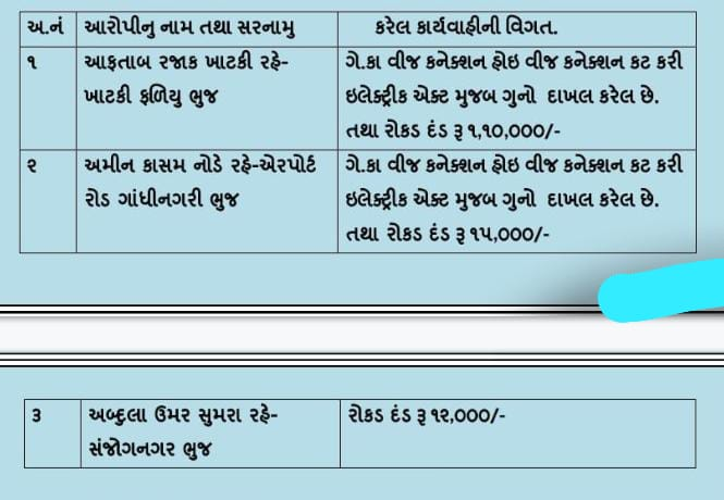 જે અન્વયે ભુજ શહેર એ.ડીવીઝન પો.સ્ટેશનના પોલીસ ઇન્સપેકટરશ્રી એ.એમ.પટેલ સાહેબના માર્ગદર્શન હેઠળ ભુજ શહેર એ. ડીવીઝન પોલીસ સ્ટેશનમા શરીર સંબધી /પ્રોહિબીશન ના આરોપીઓને ચેક કરવા ભુજ શહેર એ.ડીવીઝન પોલીસ સ્ટેશનની ટીમ બનાવેલ તથા પી.જી.વી.સી.એલના અધિકારી/કર્મચારીને સાથે રાખી ગેરકાયદેસર વીજ જોડાણ હોય તેવા ઇસમોના વિજ કનેકશન કાપી નીચે મુજબની કાયદેસરની કાર્યવાહી કરવામા આવેલ છે.