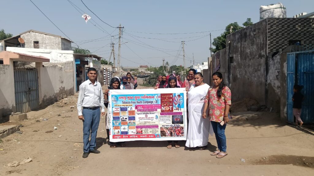 ભચાઉના ભઠ્ઠા વિસ્તારમાં તાલુકા આરોગ્ય અધિકારી શ્રી ડૉ. નારાયણ સિંઘના માર્ગદર્શન હેઠળ રાષ્ટ્રીય તમાકુ નિયંત્રણ કાર્યક્રમ (NTCP) અન્વયે “તમાકુ મુક્ત યુવા અભિયાન 3.0” અંતર્ગત રેલી સાથે જનજાગૃતિ કાર્યક્રમ યોજાયો હતો. આ કાર્યક્રમમાં COTPA-૨૦૦૩ (Cigarettes and Other Tobacco Products Act, 2003)ના નિયમો વિશે માર્ગદર્શન તથા મોઢાના કેન્સર જેવા ગંભીર રોગોના જોખમો અંગે માહિતી આપવામાં આવી હતી. જેમાં તાલુકા હેલ્થ સુપરવાઈઝર દિપકભાઈ દરજી, જયશ્રીબેન કરમટા, એડોલેશન હેલ્થ કાઉન્સેલર દિશા સુથાર, એમ.ટી.એસ. કૌશિક સુતરીયા આંગણવાડી વર્કર જાગૃતિબેન મૂછડિયા હાજર રહ્યા હતાં. કાર્યક્રમના અંતે પરિવાર, સમાજ, રાષ્ટ્ર તમાકુ મુક્ત બને તે માટે પ્રતિજ્ઞા લેવામાં આવી હતી.