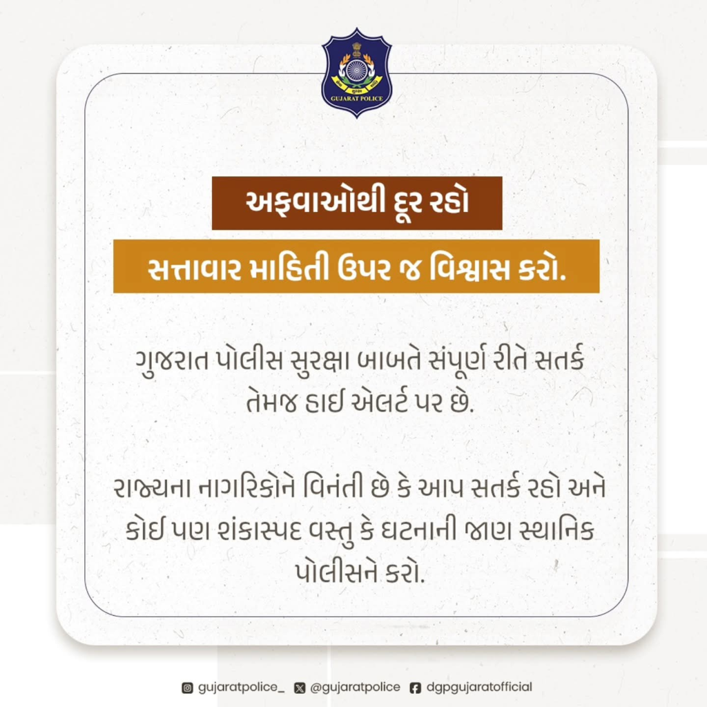 રાજ્યના નાગરિકોને વિનંતી છે કે આપ સતર્ક રહો અને કોઈ પણ શંકાસ્પદ વસ્તુ કે ઘટનાની જાણ સ્થાનિક પોલીસને કરો. પરંતુ અફવાઓથી દૂર રહો અને માત્ર સત્તાવાર માહિતી ઉપર જ વિશ્વાસ કરો.