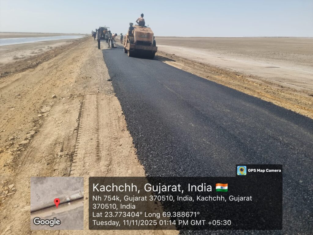 રાષ્ટ્રીય ધોરીમાર્ગ વિભાગ ગાંધીધામ હસ્તકના ઘડુલી–સાંતલપુર રોડ (રા.ધો. નં. ૭૫૪કે) અંતર્ગત આવેલા હાજીપીર–ભીટારા–ધોરડો–ખાવડા માર્ગ વર્ષોથી સિંગલ લેન તરીકે કાર્યરત છે. આ માર્ગ પર ખાવડા નજીક વિકસતા રિન્યુએબલ એનર્જી પાર્ક તથા આસપાસ સ્થિત મીઠાના ઉદ્યોગોને કારણે વાહનવ્યવહાર વધી રહ્યો છે, જેના પરિણામે સિંગલ લેન હોવાથી આ માર્ગને સતત નુકસાન થતું રહે છે. આ પરિસ્થિતિને ધ્યાનમાં રાખીને વિભાગ દ્વારા સમારકામની કામગીરી હાથ ધરવામાં આવી હતી.