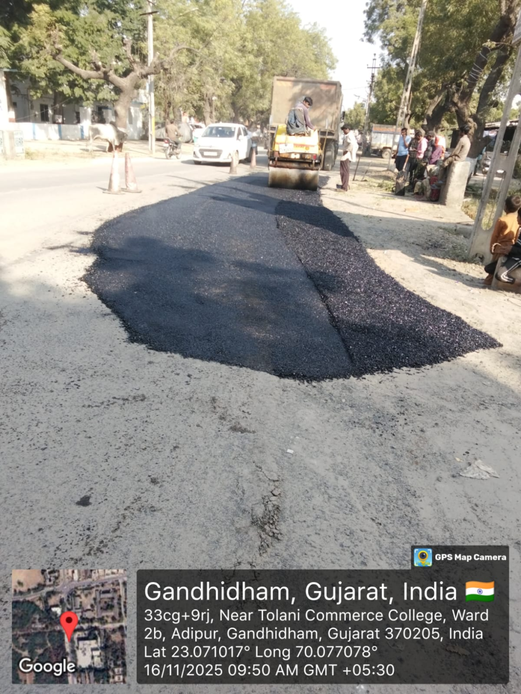 ગાંધીધામ મહાનગરપાલિકા દ્વારા જુદા જુદા વિસ્તારમાં વિવિધ જગ્યાઓ પર પેચવર્ક તેમજ રીસરફેસિંગ ની કામગીરી શરુ કરવામાં આવેલ છે. ગાંધીધામ મહાનગરપાલિકાના કમિશનરશ્રીના માર્ગદર્શન હેઠળ આ તમામ કામોની ગુણવત્તા જળવાય તે માટે ઈસ્ટ ઝોનના સપનાનગર વિસ્તારમાં કરવામાં આવેલ પેચવર્ક કામગીરીનું નિરીક્ષણ નાયબ મ્યુનિસિપલ કમિશનરશ્રી મેહુલ દેસાઈ દ્વારાતથા વેસ્ટ ઝોનના વોર્ડ ૨/બી તથા કોલેજ રોડઆદિપુર વિસ્તારમાં કરવામાં આવેલ પેચવર્ક કામગીરીનું નિરીક્ષણ નાયબ મ્યુનિસિપલ કમિશનરશ્રી સંજયકુમાર રામાનુજ દ્વારા કરવામાં આવેલ, અને ચાલી રહેલ કામગીરી ની ગુણવત્તા તપાસવામાં આવી હતી. તેમજ રસ્તાઓની થીકનેસ અને રોલીંગ અને હિટ યોગ્ય રીતે કરવામાં આવે તથા ગુણવત્તા જાળવવા સુચના આપવામાં આવી હતી.આવનારા દિવસોમાં રસ્તોના પેચવર્ક તેમજ રીસરફેસિંગની કામગીરી ઝુંબેશ સ્વરૂપે પૂર્ણ કરવામાં આવશે. તેવું મહાનગરપાલિકાની અખબાર યાદીમાં જણાવવામાં આવેલ છે.