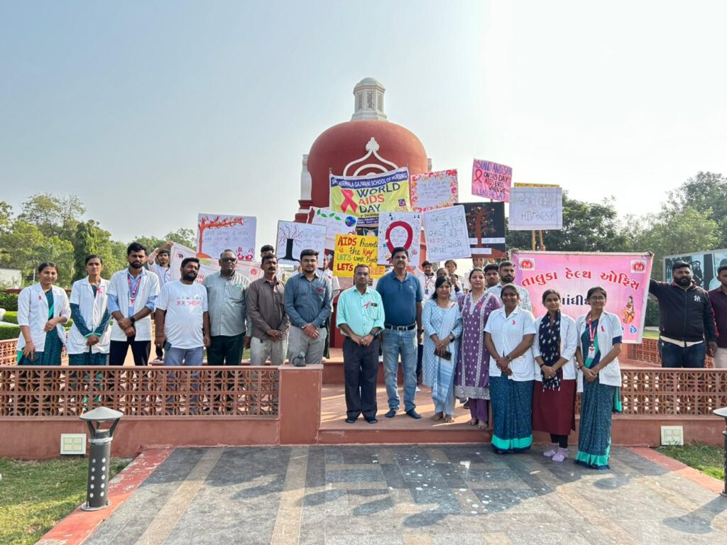 વિશ્વ એઇડ્સ દિવસ નિમિતે DTHO શ્રી ડૉ. મનોજ દવે તથા તાલુકા હેલ્થ ઓફિસરશ્રી ડૉ. દિનેશ સુતરીયાના માર્ગદર્શન હેઠળ ગજવાની નર્સિંગ કોલેજના પ્રિન્સીપાલ શ્રીમતિ નિધિબેન શર્માના સહયોગથી ICTC અને FIART રામબાગ તથા તાલુકા હેલ્થ સ્ટાફ દ્વારા HIV એઇડ્સ અવેરનેસ રેલીનું આયોજન કરવામાં આવ્યું હતું. આ રેલી ગજવાની નર્સિંગ કોલેજથી શરૂ કરી આદિપુર ગાંધી સમાધી સુધી યોજાઈ હતી. જેમાં વિદ્યાર્થીઓ અને કર્મચારીઓ ઉત્સાહભેર જોડાયા હતાં. આ સાથે રામબાગ હોસ્પિટલમાં પણ FIART અને ICTC સ્ટાફ દ્વારા HIV AIDS અવેરનેસ પ્રોગ્રામનું આયોજન કરવામાં આવ્યું હતું. આ કાર્યક્રમમાં તાલુકા હેલ્થ અને FIART MO ડૉ. ધૈર્ય બુદ્ધભટ્ટી દ્વારા બાળકોને ફ્રુટ અને એજ્યુકેશન કીટનું વિતરણ કરાયું હતું, જે સાથે આરોગ્ય બાબતે માહિતી આપવામાં આવી હતી.