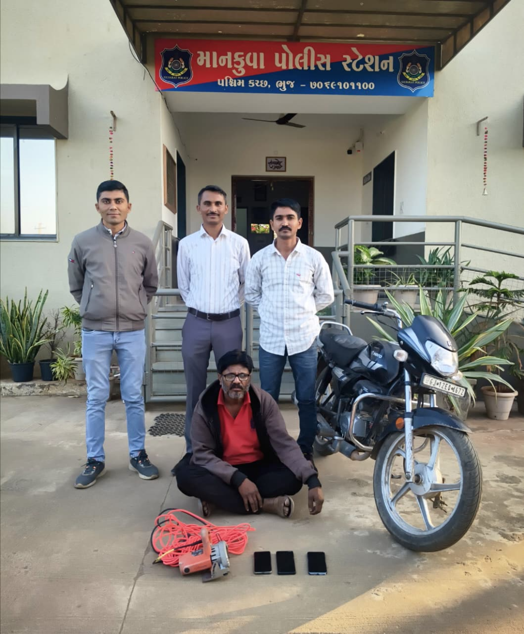 જે અન્વયે શ્રી પી.પી.ગોહિલ ઇન્ચાર્જ પોલીસ ઇન્સ્પેક્ટર માનકુવા પોલીસ સ્ટેશનનાઓએ મિલ્કત સંબંધી બનતા અટકાવવા અને ડીટેકટ કરવા સુચના આપેલ હોઇ જે અન્વયે આજરોજ પો.હેડ. કોન્સ અશોકભાઈ ડાભી તથા કિરણકુમાર પુરોહિત નાઓને મળેલ ખાનગી રાહે બાતમી હકીકત આધારે માનકુવા ગામેથી આધાર-પુરાવા વગરના ચોરી કે છળકપટથી મેળવેલ એન્ડ્રોઈડ મોબાઈલ નંગ-૦૩ તથા માર્બલ કટર મશીન નંગ-૦૧ સાથે એક ઇશમને પકડી પાડી ધોરણસર કાર્યવાહી કરવામાં આવેલ છે.