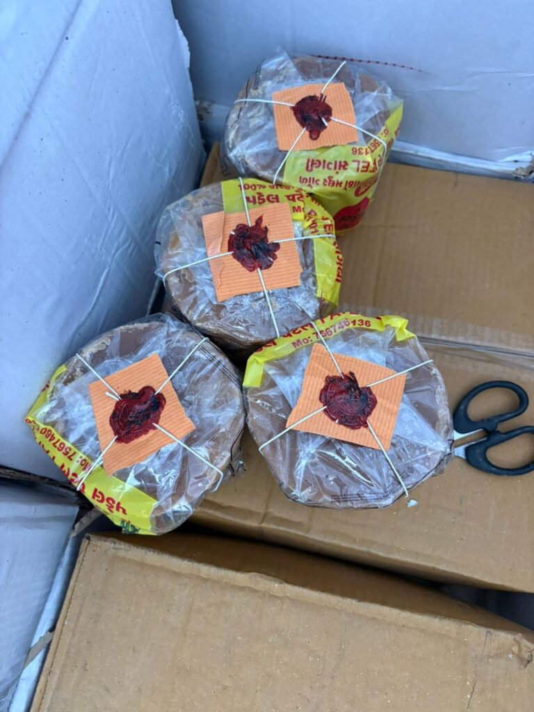 જેનો કુલ જથ્થો ૧૨ પેટી અંદાજે ૧૧૨ નંગ જેની આશરે કુલ કિંમત ૧૦,૮૧૨ છે. આ સાથે લીધેલ અન્ય ” વડેચા દેશી ગોળ ૯૦૦ ગ્રામ. કંપની પેક “, જૈનમ દેશી ગોળ ૯૦૦ ગ્રામ કંપની પેક” જેવા તમામ નમૂનાઓ પ્રયોગશાળામાં પૃથ્થકરણ અર્થે મોકલી આપેલા છે. પ્રયોગશાળાના રિપોર્ટ આવ્યા બાદ આગળની કાર્યવાહી કરવામાં આવશે.