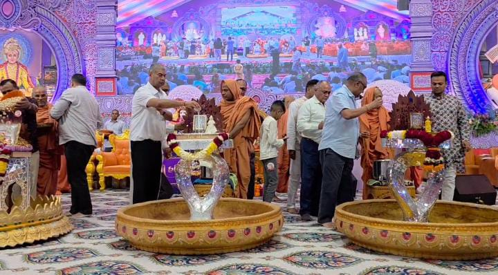 દેવો ના સાંનિધ્ય માં સુવર્ણ અને રજત શિક્ષાપત્રીઓનું કેસર ચંદન, મોતી, ડ્રાયફુર્ટ અને પંચામૃત નો અભિષેક