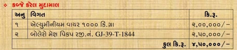 મે.પોલીસ મહાનિરીક્ષકશ્રી ચિરાગ કોરડીયા સાહેબ સરહદી રેન્જ ભુજ કચ્છ તથા મે.પોલીસ અધિક્ષકશ્રી સાગર બાગમાર સાહેબ પુર્વ કચ્છ ગાંધીધામ તથા મે.નાયબ પોલીસ અધિક્ષકશ્રી સાગર સાંબડા સાહેબનાઓએ મિલકત તથા શરીર સબંધી અનડિટેક્ટ ગુનાઓ ડિટેક્ટ કરી આરોપીઓને પકડી પાડવા આપેલ સુચના અન્વયે પોલીસ ઇન્સ્પેક્ટર શ્રી જે.એમ.જાડેજા લાકડીયા પોલીસ સ્ટેશનનાઓની સુચના આધારે લાકડીયા પોલીસ સ્ટાફના માણસો દ્વારા છએક મહિના પહેલા લાકડીયા પોલીસ સ્ટેશન હદ વિસ્તારના શિવલખા સિમ વિસ્તારમાથી નિકળતી પાવરગ્રીડ વિજલાઇનમાંથી આશરે પાંચેક લાખની એલ્યુમીનીયમ વાયરની ચોરી તથા નુકશાની થયેલ હોય જે હ્યુમન સોર્સ તથા ટેકનીકલ સર્વેલસ આધારે ત્રણ ચોર ઇસમો તથા ચોરીનો માલ ખરીદનાર ઇસમને પકડી ચોરીમા ગયેલ મુદામાલ રિકવર કરી કાયદેસર કાર્યવાહી કરવામા આવેલ છે.