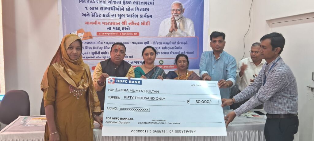 નગરપ્રાણિકા પ્રમુખથીએ જણાવ્યું હતું કે, વડાપ્રધાન નરેન્દ્રભાઈ મોદીના દ્રષ્ટિવંત નેતૃવમાં ગુજરાતના વિકાસનો જે મજબૂત પાવી નખાવી, તેને આજે મુખ્યમંત્રી ભૂપેન્દ્રભાઈ પટેલના સક્ષમ માર્ગદર્શન sઠળ એક નવી ઊંચાઈ મતી છે. ગુજરાતની આ વિકાસયાતએ ક્ષમાજના ઉબાડાના માનવી અને ગામે ગામ સુધી સુરાસન અને કલ્યાણના ફળ પડીચ ડયા છે. તેમણે જરાવ્યું હતુ કે, પ્રધાનમંત્રી નરેનભાઈ મોદીનું આત્મનિર્ભર ભારતનું સ્વપન સાકાર કરવા માટે આ થીજના એક મજબૂત પગલુ છે. કોરોના મહામારીના કપરા સમયમાં જે નાના વેપારીઓના પંધા રોજગારને અસર થઈ હતી, તેમને ફરી બેઠા કરવા માટે આ યોજનાં જીવનરેખા બની છે.