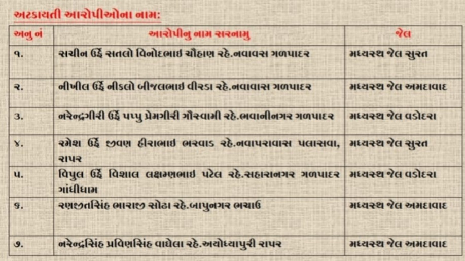 પોલીસ મહાનિરીક્ષક શ્રી ચીરાગ કોરડીયા સાહેબ, સરહદી રેન્જ ભુજ તથા પોલીસ અધિક્ષકશ્રી સાગર બાગમાર સાહેબ પૂર્વ કચ્છ, ગાંધીધામનાઓ તરફથી જિલ્લામાં પ્રોહીબીશનની પ્રવૃત્તિ આચરતા ઈસમો પર રોક લગાવવા અને જરૂરી અટકાયતી પગલા લેવા સુચના આપેલ હોય જેથી પોલીસ ઇન્સપેક્ટર એન.એન.ચુડાસમા એલ.સી.બી. દ્વારા પ્રોહી.બુટલેગરો દ્રારા બહારના રાજ્યમાંથી પ્રતિબંધિત વિદેશી દારૂનો નાના-મોટા પ્રમાણમાં જથ્થો મંગાવી સંગ્રહ કરી હેરફેર કરવા સબંધે તેમના વિરુધ્ધ અલગ અલગ પોલીસ સ્ટેશનોમાં પ્રોહીબીશનાં ગુનાઓ દાખલ થયેલ હોય જેથી એલ.સી.બી દ્વારા પાસા દરખાસ્તો તૈયાર કરતા પોલીસ અધિક્ષકશ્રી દ્વારા સદરહુ પાસા દરખાસ્તો કલેક્ટરશ્રી કચ્છ-ભુજ નાઓ તરફ મોકલી આપવામાં આવેલ. જે અન્વયે મ્હે.કલેક્ટરશ્રી આનંદ પટેલ સાહેબ કચ્છ ભુજ દ્વારા પાસા દરખાસ્ત મંજુર રાખી આરોપીઓની અટકાયત કરવા પાસા વોરંટ ઈશ્યુ ક૨તા એલ.સી.બી.ની ટીમ દ્વારા કુલે-સાત આરોપીઓને પાસા તળે અટકાયતમા લઇ તેઓને મધ્યસ્થ જેલ વડોદરા, સુરત તેમજ અમદાવાદ જેલ હવાલે કરી મોકલી આપવામા આવેલ છે.