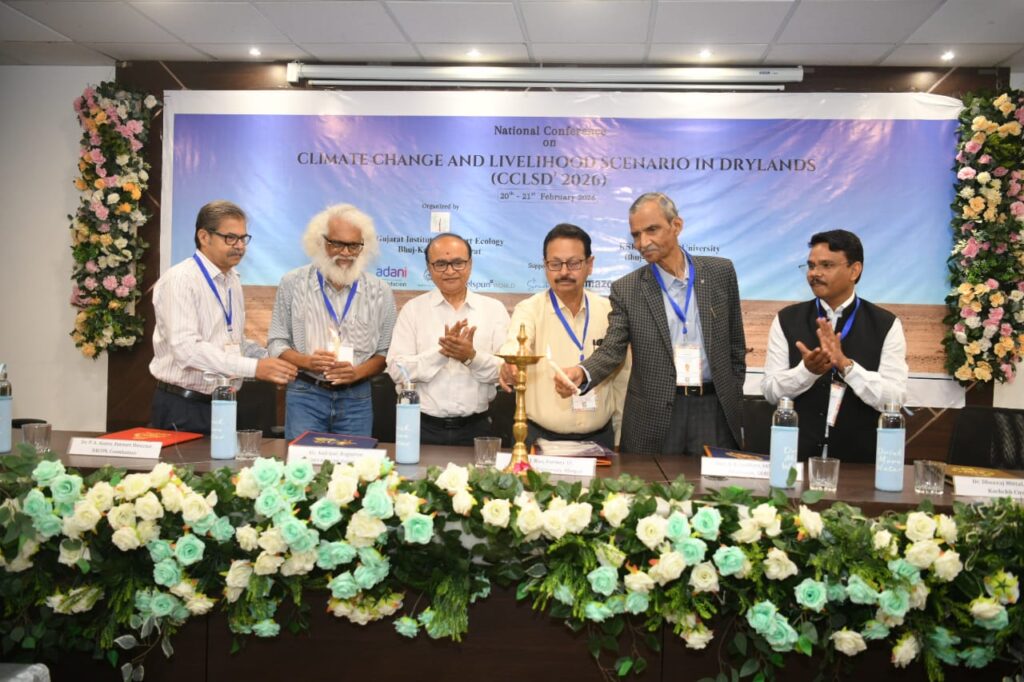 ગુજરાત ઇન્સ્ટિટ્યૂટ ઓફ ડેઝર્ટ ઇકોલોજી (GUIDE), ભુજ દ્વારા કચ્છના શુષ્ક પ્રદેશોમાં આબોહવા પરિવર્તન અને આજીવિકાની સ્થિતિ પર ૨૦ અને ૨૧ ફેબ્રુઆરી ૨૦૨૬ દરમિયાન બે દિવસીય રાષ્ટ્રીય પરિસંવાદ (CCLSD’ 2026) નું આયોજન કરવામાં આવ્યું હતું. આ પરિસંવાદના પેટ્રન તરીકે સંસ્થાના ચેરમેન શ્રી વી.એસ. ગઢવી (નિવૃત્ત IAS) અને વાઈસ-ચેરમેન શ્રીમતી વિજયાલક્ષ્મી શેઠ (નિવૃત્ત IPoS) એ માર્ગદર્શન પૂરું પાડ્યું હતું. સમગ્ર કાર્યક્રમનું સંચાલન ગાઈડના ડાયરેક્ટર ડો. વી. વિજય કુમાર, ઓર્ગેનાઈઝિંગ સેક્રેટરી ડો. રચના ચંદ્રા અને સહ-સેક્રેટરીઓ ડો. નિકુંજ ગજેરા તથા ડો. એસ.કે. સાજન દ્વારા કરવામાં આવ્યું હતું.