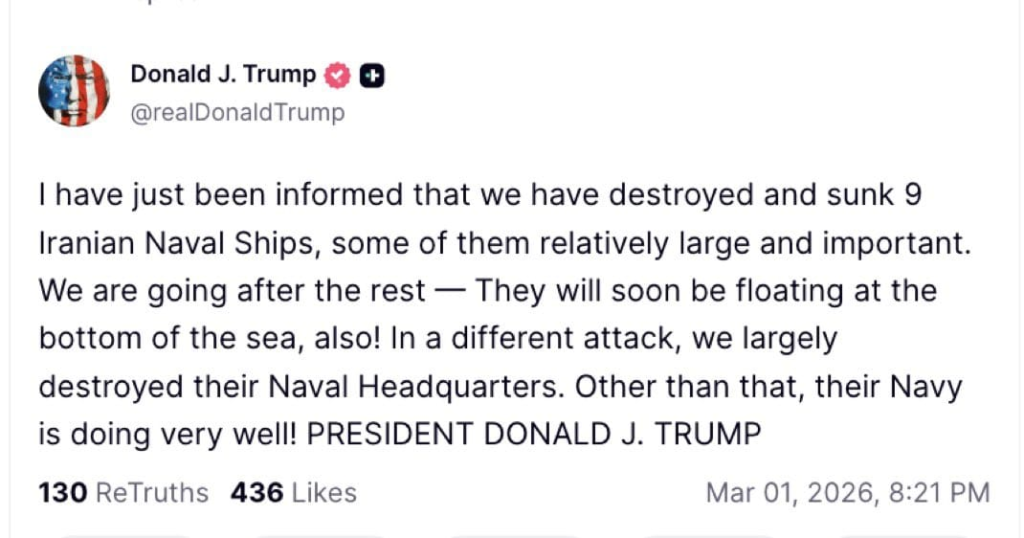 “મને હમણાં જ જાણ કરવામાં આવી છે કે અમે 9 ઈરાની નૌકાદળના જહાજોનો નાશ કર્યો છે અને તેમને ડૂબાડી દીધા છે, જેમાંથી કેટલાક પ્રમાણમાં મોટા અને મહત્વપૂર્ણ છે.