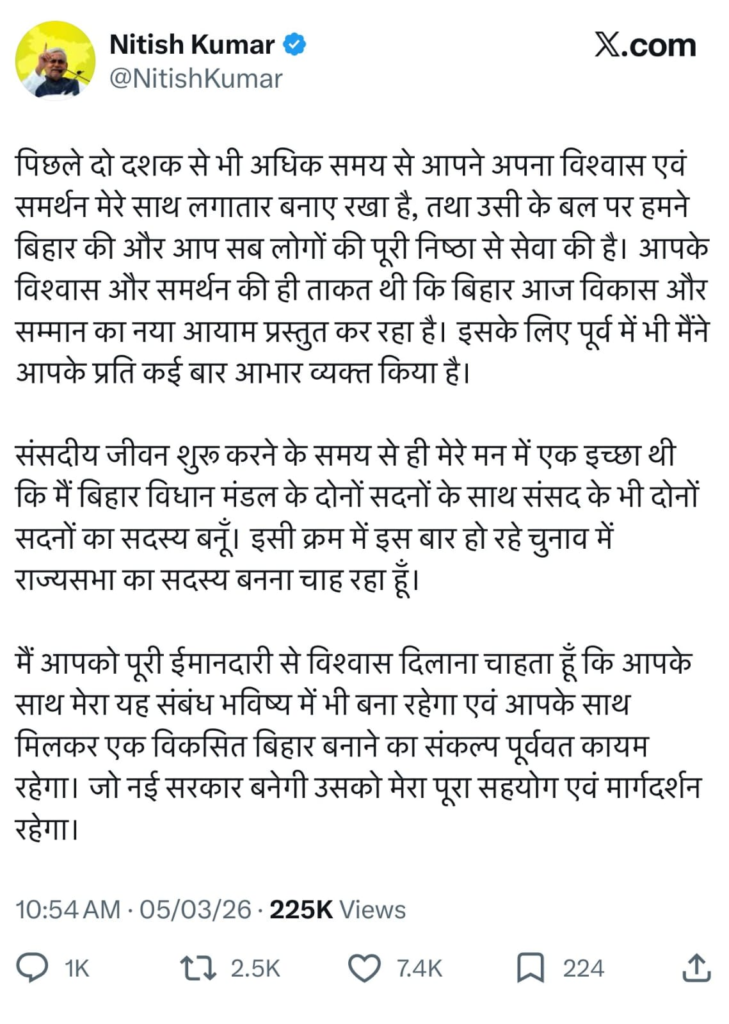 નીતીશ કુમારની બિહારનું મુખ્યમંત્રી પદ છોડવાની ઘોષણા