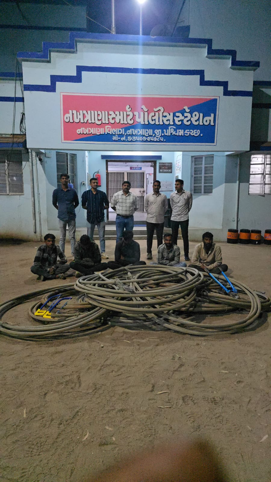 જે અનુસંધાને લોકલ ક્રાઇમ બ્રાન્ચ પશ્ચિમ કચ્છ-ભુજના પોલીસ સબ ઇન્સ્પેકટરશ્ર એમ.એચ.શીણોલ સાહેબનાઓએ લોકલ ક્રાઇમ બ્રાન્ચના સ્ટાફને જીલ્લામાં ગેરકાયદેસર પ્રવૃત્તી કરતા ઇસ-વિરૂધ્ધ કાયદેસરની કાર્યવાહી કરવા સુચના આપેલ હતી. જે સુચના મુજબ એ.એસ.આઇ. વિકેશભાદ જયંતીભાઈ રાઠવા તથા શક્તિસિહ ભગવતસિહ ગઢવી તથા પો.હેડ કોન્સ સુનિલભાઇ પ્રવિણભાઇ પરમા તથા લાખાભાઇ હીરાભાઇ રબારી તથા અશ્વિનભાઇ ગઢવીનાઓ પ્રાઇવેટ વાહનથી નખત્રાણા તાલુક વિસ્તારમા આધુનીક કીટ સાથે પેટ્રોલીંગમાં હતા તે દરમ્યાન ફરતા ફરતા વડવાભોપા ગામના બસ સ્ટેશ-પાસે પહોંચતા વિકેશભાઈ રાઠવાનાઓને ખાનગી રાહે બાતમી હકીકત મળેલ કે, “ગફુર મામદ નોતિયા રહે.ભુજવાળો તથા સાહીલ ઈશા મોખા રહે.નાના વરનોરા તા.ભુજવાળાઓ તેઓની સાથે અન્ય ત્રણ ચા માણસોએ ત્રણ-ચાર દિવસ અગાઉ વડવાભોપા ગામની પશ્વિમ બાજુ આવેલ સીમમાથી નીકળત્ એલ્યુમીનીયમ તારની લાઇનમાંથી એલ્યુમીનીયમના વાયરોની ચોરી કરીને વાયર વડવાભોપા ગામન સીમમા સંતાડી દીધેલ હતા અને તે વાયરો આજ રોજ ત્યાથી લઇ જઇ સગેવગે કરવાની ફીરાકમા છે અને હાલે તેઓ સીમમા વાયર લેવા માટે આવવાના છે” જેથી મળેલ સચોટ અને ભરોસાપાત્ર બાતમી હકીક અંગે તુરત જ વર્કઆઉટ કરી તપાસ કરતા પાંચ ઇસમો મળી આવેલ અને તેમના કબ્જાના એલ્યુમીનીયમન વાયરોના ગુચડા હોઇ જે બાબતે મજકુર ઇસમો પાસે રહેલ વાયરો બાબતે કોઇ આધાર પુરાવા કે બીટ બાબતે પુછતા નહી હોવાની હકીકત જણાવેલ જેથી મજકુર ઇસમોની યુકતી પ્રયુકતીથી પુછપરછ કરત જણાવેલ કે આ એલ્યુમીનીયમના વાયરો આજથી ત્રણ-ચાર દિવસ અગાઉ રાત્રીના સમયે અમો હાજ પાંચેય ઇસમો અમારા મીત્ર ઇમરાન કુંભાર રહે-અંજારવાળા સાથે મળી એલ્યુમીનીયમના વાયરો ચોઽ કરવાનુ નક્કી કરેલ અને જે વાયરો ચોરી કર્યા પછી ઇમરાન કુંભારને આપવાનુ નક્કી કરેલ અને તે અમોને આ વાયર લેવા તથા અમારા આવવા જવા માટે બોલેરો પીકઅપ ગાડી જેના ડ્રાઇવર તરીકે દાઉદ ઉ દાઉભા અબ્દુલા કુંભાર રહે-લખુરાઇ ચાર રસ્તા ભુજ વાળાને મોકલેલ તથા વાયર કાપવા માટેના સાધનને આપેલ જેથી અમો સાથે મળી અહી આગળ બંધ લાઇનમાથી એલ્યુમીનીયમના વાયરો કાપી તેના ગુંચળ વાળી રાત્રે મોડુ થઇ જતા ચોરી કરેલ વાયરો બાવળોની ઝાડીમા સંતાડી દીધેલ અને ત્યારબાદ આજ રોજ આ વાયરો લેવા માટે આવેલ હતા અને તે વાયરો અમે ઇમરાન કુંભાર દ્વારા મોકલેલ જે ગાડી અહીયાથી ભાગી ગયેલ છે તેમા ભરી અંજાર ખાતે મોકલાવાના હતા તેવુ જણાવેલ તેમજ સાથેના માણસોએ પણ ઉપરોક્ત મુજબની હકીકત જણાવેલ જે અંગે નખત્રાણા પોલીસ સ્ટેશનમાં ખરાઈ કરતાં નીચે મુજબનો ગુનો દાખલ થયેલ જેથી મજકુર ઇસમને BNSS ની કલમ ૧૦૬ મુજબ મુદ્દામાલ કબ્જે કરી તથા BNSS ની કલમ ૩૫(૧)(ઇ) મુજબ અટક કરી આગળની કાર્યવાહી સારૂ નખત્રાણા પોલીસ સ્ટેશન ખાતે સોપવામાં આવેલ ๒.