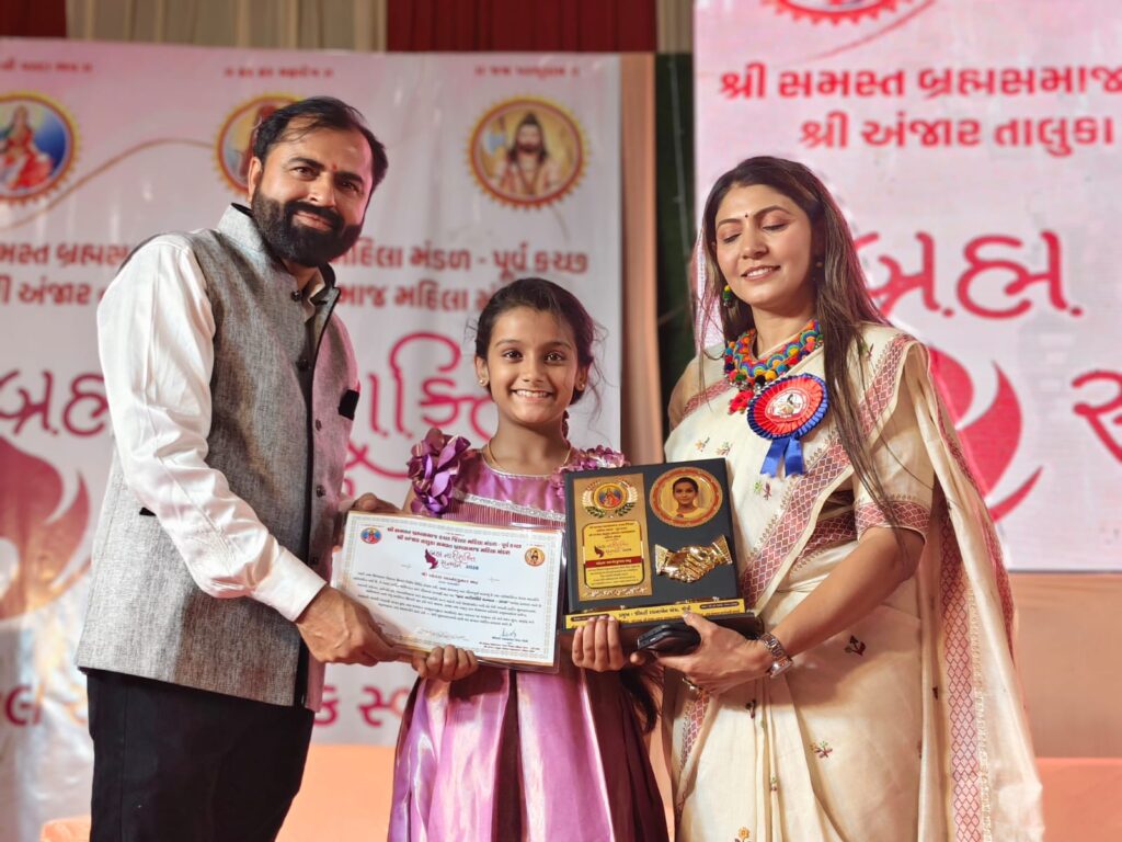 ગાંધીધામ : કચ્છ જિલ્લાના ભુજની નાની કલાકાર અંતરા આનંદકુમાર ભટ્ટએ પોતાની અદભુત કલા અને મહેનત દ્વારા બ્રહ્મનારીશકિત સન્માન-ર૦ર૬નુ બિરુદ પ્રાપ્ત કરી અને સમગ્ર સ્વ.રસિકલાલ ભટ્ટ પરીવાર, એરફોર્સ સ્કુલ ભુજ, તથા બ્રહ્માસમાજ અને કચ્છ જિલ્લાનું નામ રોશન કર્યું છે. તાજેતરમાં જ આંતરરાષ્ટ્રીય મહીલા દીવસની વિશિષ્ટ ઉજવણીના ભાગરૂપેશ્રી સમસ્ત બ્રહ્મસમાજ કચછ જિલ્લા મહીલા મંડળ તથા પૂર્વ કચ્છ અને શ્રી અંજાર તાલુકા સમસ્ત બ્રહ્મસમાજ મહીલા મંડળ દ્વારા નારીશકિતના ઉત્તમ આદર્શોને ચરીતાર્થ કરી અન્ય દીકરીઓ માટે પ્રેરણારૂપ બની રહે તે માટે વિવિધ ક્ષેત્રોમાં રાજય-રાષ્ટ્રીય કક્ષાએ હિર ઝળકાવનાર મહીલાઓના વિશિષ્ટ સન્માનનો કાર્યક્રમ યોજાયો હતો.
