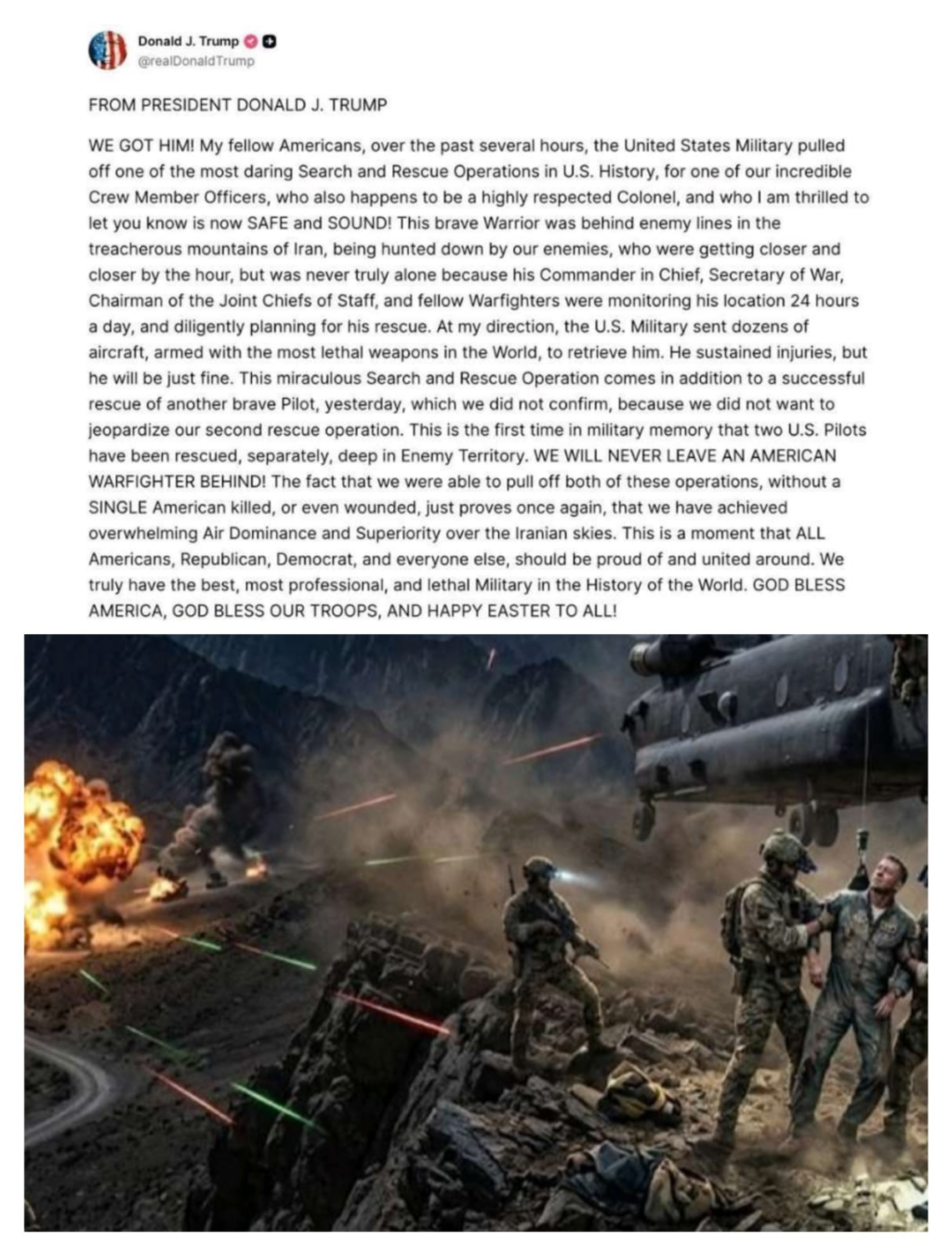 અમેરિકા અને ઈરાન વચ્ચે ચાલી રહેલા સંઘર્ષમાં અમેરિકી સૈન્યે એક અત્યંત જટિલ અને જોખમી મિશન પાર પાડ્યું છે . ઈરાનના દુર્ગમ પહાડી વિસ્તારોમાં 48 કલાક સુધી દુશ્મનોથી બચીને છુપાયેલા અમેરિકી વાયુ સૈનિકને સુરક્ષિત રીતે બહાર કાઢવામાં આવ્યો છે. રાષ્ટ્રપ્રમુખ ડોનાલ્ડ ટ્રમ્પે આ મિશનની સફળતાની પુષ્ટિ કરતા ગૌરવ સાથે જણાવ્યું કે, “અમે તેને શોધી કાઢ્યો છે (WE GOT HIM!)”.સૂત્રો દ્વારા મળતી માહિતી અનુસાર જ્યારે અમેરિકી દળોને સૈનિકનું સચોટ લોકેશન મળ્યું, ત્યારે ટ્રમ્પના આદેશથી એક વિશાળ સૈન્ય ઓપરેશન શરૂ કરવામાં આવ્યું જેમાં ડઝનબંધ યુદ્ધવિમાનો અને હેલિકોપ્ટરો તૈનાત કરવામાં આવ્યા. ઈરાની કોન્વોય ને સૈનિક સુધી પહોંચતા રોકવા માટે અમેરિકી વિમાનોએ ભારે બોમ્બમારો કર્યો.જયારે એક્સટ્રેક્શન ઝોન પાસે અમેરિકી કમાન્ડો અને ઈરાની દળો વચ્ચે સીધી અથડામણ થઈ હતી.આ ઓપરેશન દરમિયાન એક અમેરિકી હેલિકોપ્ટર પર ફાયરિંગ થયું અને એક A-10 એરક્રાફ્ટ તોડી પાડવામાં આવ્યું, જેના પાયલોટને બાદમાં પર્સિયન ગલ્ફમાંથી બચાવી લેવાયા જેવી મુશ્કેલીઓનો સામનો કર્યો હતો વધુમાં ટ્રમ્પે ખુલાસો કર્યો કે આ ઓપરેશન પહેલા એક બીજા પાયલોટને પણ બચાવવામાં આવ્યો હતો, પરંતુ બીજા મિશનની સુરક્ષાને ધ્યાનમાં રાખીને તેને ગુપ્ત રખાયું હતું. સૈન્ય ઇતિહાસમાં આ પહેલીવાર છે જ્યારે બે અમેરિકી પાયલોટોને અલગ-અલગ રીતે દુશ્મનના ઈલાકામાંથી બચાવી સુરક્ષિત બહાર કઢાયા હોય તેમજ આ ઓપરેશન બાદ ટ્રમ્પે અમેરિકી સૈન્યની તાકાતનું પ્રદર્શન કરતા કહ્યું કે, “અમે સાબિત કરી દીધું છે કે અમે આકાશમાં સંપૂર્ણ વર્ચસ્વ (Air Dominance) ધરાવીએ છીએ. અમે ક્યારેય કોઈ અમેરિકી યોદ્ધાને દુશ્મનના ભરોસે પાછળ નહીં છોડીએ.” હાલમાં બચાવવામાં આવેલા સૈનિકને સારવાર માટે કુવૈત (Kuwait) લઈ જવામાં આવ્યો છે.