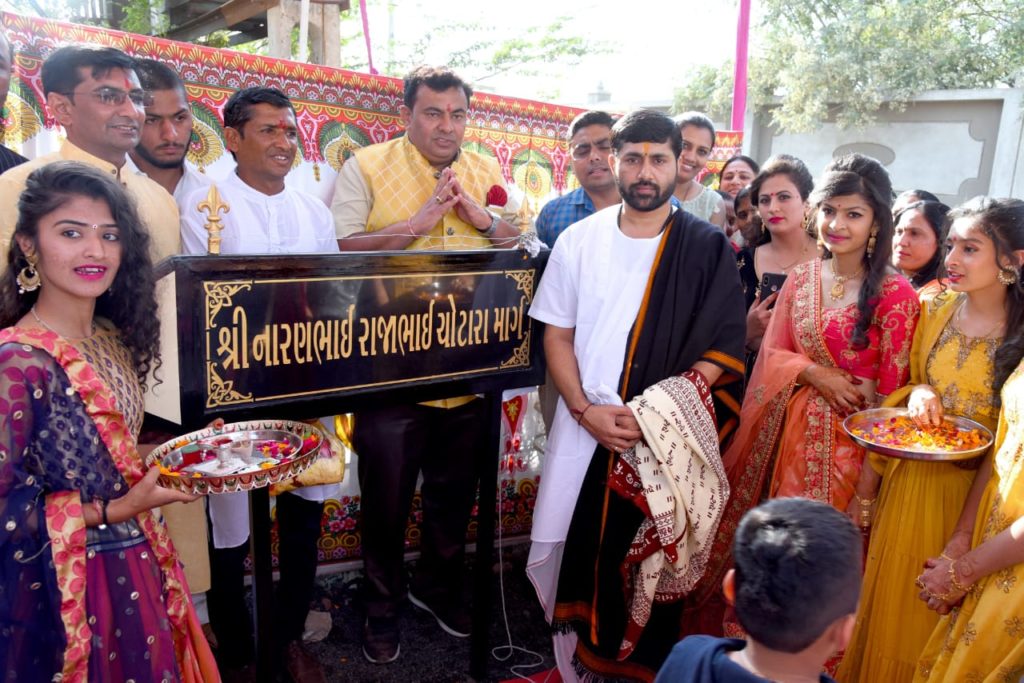 અંજાર શહેર ના આંગણે પ.પુ.શ્રી જીગ્નેશ દાદા ના હસ્તે બે મહાનુભાવો શ્રી રાજાભાઈ રામભાઈ ચોટારા તેમજ શ્રી નારણભાઇ રાજાભાઈ ચોટારા ના નામે રોડ નામકરણ કરવામા આવેલ હતું,આ શુભ પ્રસંગે જગ પ્રસિદ્ધ ભાગવતાચાર્ય પ.પુ.શ્રી જીગ્નેશ દાદા શ્રી જીગ્નેશ દાદા,હનુમાન ગુફા વીડી ના મહંત શ્રી રામધાર શાસ્ત્રીજી,સોરઠીયા આહીર સમાજ અંજાર પ્રમુખ શ્રી પ્રેમજીભાઈ પેડવા,શિણાય સમાજ પ્રમુખ શ્રી જેન્તીભાઇ હડિયા,માધાપર સમાજ પ્રમખ શ્રી માવજીભાઈ,કરછ આહીર મંડળ ના ઉપ પ્રમુખ શ્રી રમેશભાઈ, ગોંડલ થી છોટાળા પરિવાર ના લલિતભાઈ,વિનોદભાઈ,રમેશભાઈ,સંદીપભાઈ, ચોટારા પરિવાર થી શિવજીભાઈ,લાલજીભાઈ,નરશીભાઈ,મનજીભાઇ,જીતેન્દ્રભાઈ,પ્રવીણભાઈ,કિશનભાઇ બલદાણીયા,ભરતભાઈ,નીરજભાઈ,રૂપેશભાઈ,સંદીપભાઈ,પ્રતિકભાઈ,દિપ,રોહન,વીર,વિવેક,જય હડિયા,મહેન્દ્ર હડિયા,અમીત બલદાણીયા,મુન્ના તિવારી, તથા ચોટારા પરિવાર ના બહેનો જયાબેન,જમનાબેન,હીરાબેન,રૂક્ષમણીબેન,ગીતાબેન,કંચનબેન,ઇન્દીરાબેન,વર્ષાબેન,નીલાબેન,મંજુલાબેન,પુષ્પાબેન,હંસાબેન,જયશ્રીબેન, રશ્મિ,યશ્વી,મહેક,હેત્વી,વિશ્વા ના વરદ હસ્તે સ્વસ્તીક તેમજ કંકુ ચાંદલા કરી અનાવરણ કરવામાં આવેલ હતું,
