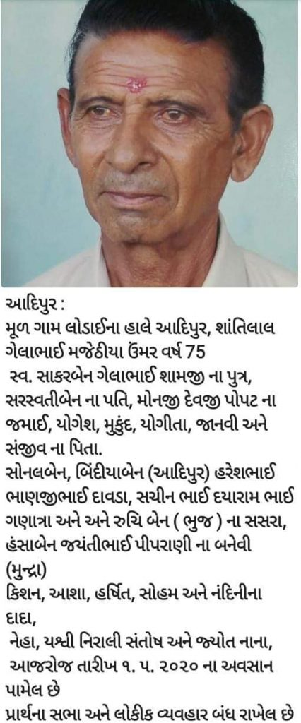 *આપણાં વર્તમાન ભુજ નવી જથ્થાબંધ શરાફ ગૌ સેવાના મુખ્ય પ્રમાણિક પારદર્શક પોઝીટીવ પરફોર્મન્સ પાવરલૂમ પાવરફૂલ પ્લેટફોર્મ ઊભું કરનાર પરમ આદરણીય વંદનીય મંગલકારી મહામાનવાત્મા ગૌભક્ત પથ દર્શક “સચીનભાઈ દયારામભાઈ ગણત્રા” ના સસરા ( ફાધર ઈન લો) અને પૂર્વ કચ્છ આદિપુર આશાપુરા ગ્રુપનાં મુખ્ય સંચાલક યોગેશભાઈ ઠક્કર (મજેઠીયા) નો ના પિતાજી શાંતિલાલ ગેલાભાઈ ઠક્કર (મજેઠીયા) નું ટુંકી બીમારી બાદ અવસાન થતાં આ બન્ને ભુજ અને આદિપુર સેવાકીય પ્રવૃત્તિઓમય સમિતિના સેવકગણોમાં ઊંડા શોકની લાગણી છવાઈ ગઈ છે નિધનના બીજા દિવસે આ તમામ સમિતિના સેવકગણો વહેલી સવારે બે મિનિટ મૌન રાખી “શ્રીકૃષ્ણમ્ શરણમ્ ની પ્રાર્થના ધૂન બોલાવી સેવાકીય શ્રમયજ્ઞમાં સમર્પિતભાવે પ્રવૃત્તિઓમય નિત્યકર્મોની શુભ શરૂઆત કરી હતી શાંતિલાલ સ્વભાવે પરોપકારી જીવદયાપ્રેમી સેવા કાર્યમાં વ્યસ્ત રહેતાં તેમનાં સુપુત્ર યોગેશભાઈ આદિપુરમાં આશાપુરા ગ્રુપનાં મુખ્ય સંચાલક છે અને તેઓ આ વૈશ્વિક મહામારી કોરોના વાયરસ ના હિસાબે સાવચેતીના પગલારૂપે ભારતમાં લોકડાઉન કર્ફ્યુમાં તેમનાં આદિપુર ગાંધીધામ ઝુંપડપટ્ટી વિસ્તારમાં અને મસ્તરામોને એમ દરરોજ બન્ને ટાઈમ બપોરે અને રાત્રે બે બે હજાર જેટલા લોકોને જમવાનું પહોંચાડી રહ્યાં છે વિવિધ પ્રકારના દાતાઓના જુદા જુદા પ્રકારની સકારાત્મક સહયોગી સહકારભરી મદદથી તથા ભુજમાં તેમનાં અન્ય એક સેવાભાવી જમાઈ વર્તમાન ભુજ નવી જથ્થાબંધ શરાફ બજાર ગૌ સેવા સમિતિના કેપ્ટન પણ આ સમિતિની કમાન સંભાળતા જ સેવાકીય પ્રવૃત્તિમાં નવો જોમ અને જુસ્સા સાથે ટીમ વર્ક દ્વારા એક શોકમાં ગરકાવ થઈ ગયેલા શોક મગ્નોમાં નવા ચેતનવંતા પ્રાણ ફૂંકયા છે ત્યાં આ સેવાભાવી જીવદયાપ્રેમી ના નિધનથી ફરી પાછું ગમગીન વાતાવરણ ઊભું થયું છે.