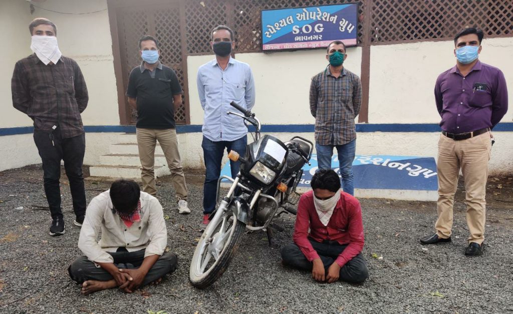 એસ.ઓ.જી. ભાવનગર શહેર તથા જીલ્લામાં મિલ્કત સંબંધી ગુન્હાઓ બનતા અટકાવવા માટે તથા બનેલ ગુન્હાનો ભેદ ઉકેલી કાઢવા ભાવનગર પોલીસ અધિક્ષકશ્રી જયપાલસિંહ રાઠૌડે જીલ્લાના પોલીસ અધિકારીઓને સુચના આપેલ જે અનુસંધાને એસ.ઓ.જી. શાખાના પોલીસ ઇન્સ્પેકટર એસ.એન.બારોટના માર્ગદર્શન હેઠળ એસ.ઓ.જી.પોલીસને મળેલ બાતમી હકિકત આધારે ગઇ કાલ તા.૦૧/૦૬/૨૦૨૦ ના રોજ મહિલા કોલેજ સર્કલ પાસેથી આરોપી (૧) પ્રફુલભાઇ ઉર્ફે પપ્પુ શત્રુધ્નભાઇ પરમાર /કોળી ઉવ. ૨૪ ધંધો- મજુરીકામ રહે. બ્લોક નં. ૨૨-બી, રામેશ્વર સોસાયટી, હાદાનગર રોડ, ભાવનગર (૨) વિજયભાઇ પ્રેમજીભાઇ પરમાર /કોળી ઉવ. ૩૧ ધંધો-મજુરી રહે. શ્રીજીનગર પ્લોટ નં. ૨૨, સિદસર રોડ ભાવનગરવાળાઓને નંબર પ્લેટ વિનાના હિરો સ્પ્લેન્ડર મોટર સાયકલ ચેસીસ નંબર MBLHA10CGGHC75184 તથા એન્જીન નંબર- HA10ERGHC75947 સાથે ઉભો રાખી મો.સા.ના માલીકી બાબતે પુછતા યોગ્ય અને સંતોષકારક જવાબ નહી આપતા મો.સા. નંબર આધારે પોકેટ કોપ એપ્લીકેશનમાં માલીકી પણાની ખરાઇ કરતા અન્યના નામે મો.સા. રજીસ્ટર હોય જે બાબતે મજકુર યોગ્ય ખુલાસો નહી કરતા મો.સા.ની. કિ.રૂ।. ૨૫૦૦૦/- ગણી કબ્જે કરેલ અને મજકુરની અટકાયત કરી રેકર્ડ ઉપર ખરાઇ કરતા આ મોટર સાયકલ ચોરી બાબતે ઘોઘારોડ પોલીસ સ્ટેશનમાં મોટર સાયકલ ચોરી બાબતે ફરિયાદ રજીસ્ટર થયેલ છે. મજકુર બંન્ને સામે કાયદેસર કાર્યવાહી કરી ઘોઘારોડ પોલીસ સ્ટેશન ખાતે સોપી આપેલ છે.