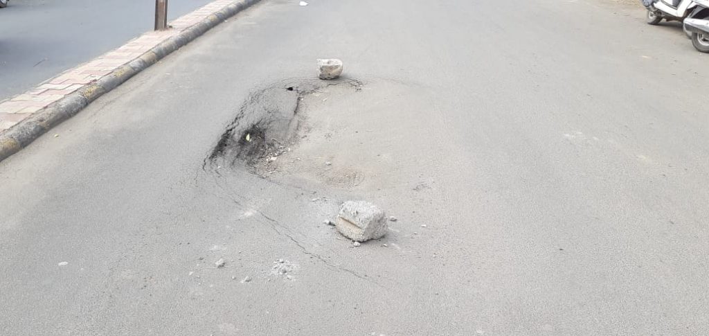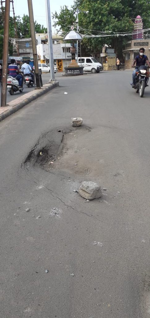 હોસ્પિટલ રોડ થી લાલ ટેકરી તરફ જતાં V H પટેલ ની હોસ્પિટલ ની બાજુમાં રોડ બેસી જતાં ત્યાના નાગરિકો દ્વારા પથર મૂકી અને જે અહી થી પસાર થતાં રાહદારીઓ ને કોઈ જાનહાનિ ના થાય તે માટે પથર રાખવા માં આવ્યા અને ટુકસમય પહેલાજ આ રોડ ની કામગીરી કરવા માં આવી હતી હજુ તો વરસાદ સરખું સરૂ થયો નથી અને ભુજ શહેર ના રસ્તાઓ ની હાલત બતાવે છે કે તંત્ર ની કેટલી નબળી કામગીરી હસે ? (રીપોટ બાય તેજસ પરમાર )